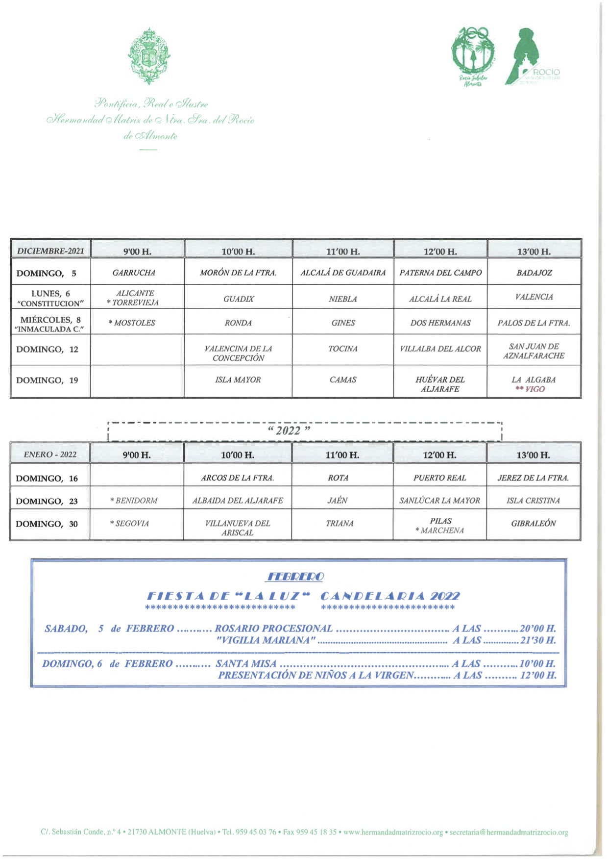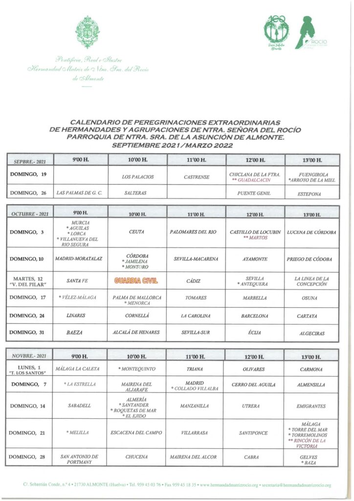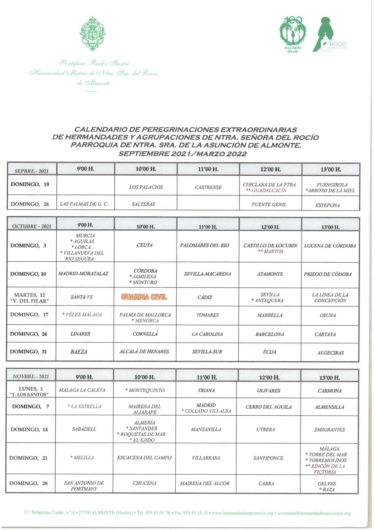 Calendario de Peregrinaciones Hdades. del Rocío 2021-2022