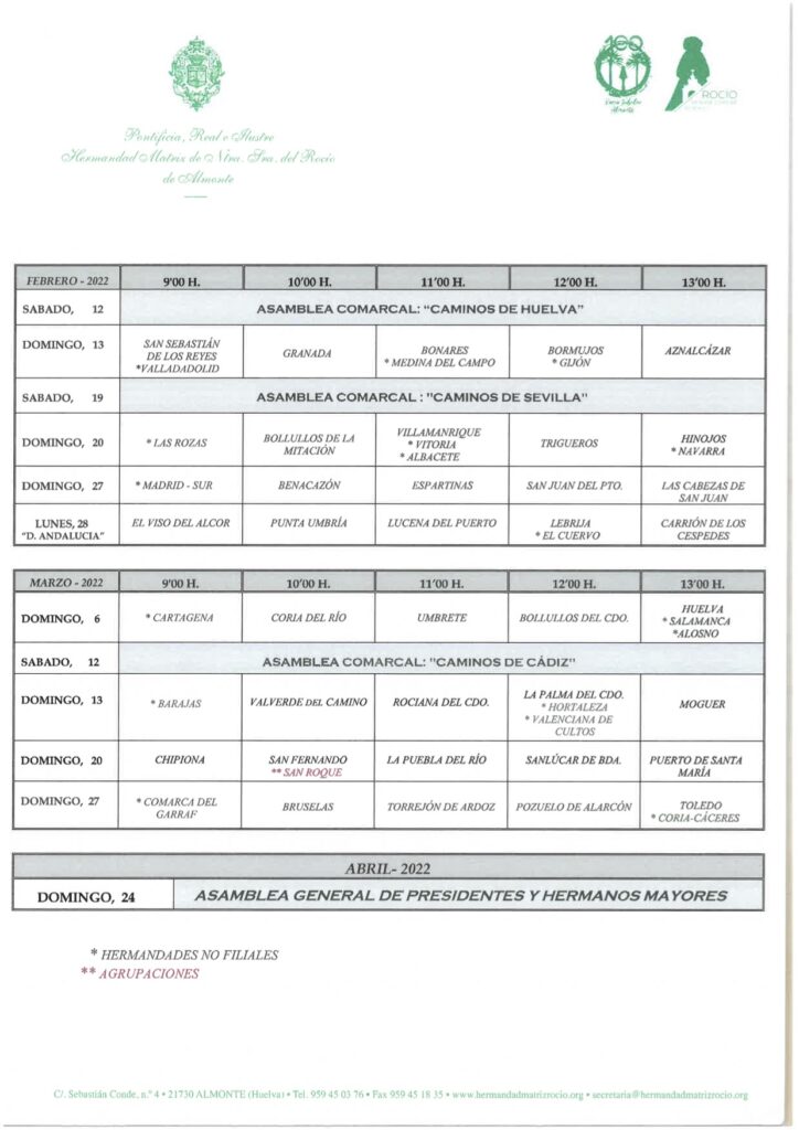 1.- La Hermandad Matriz confirmará por correo electrónico y por teléfono quince días antes, a cada hermandad filial, su peregrinación a la parroquia de Ntra. Sra. de la Asunción de Almonte, de acuerdo con lo establecido en el calendario oficial de hermandades 2021-2022. Aquella que no pueda venir en la fecha establecida en el mismo, lo hará en el calendario del año siguiente. No cabe, por tanto, el aplazamiento.