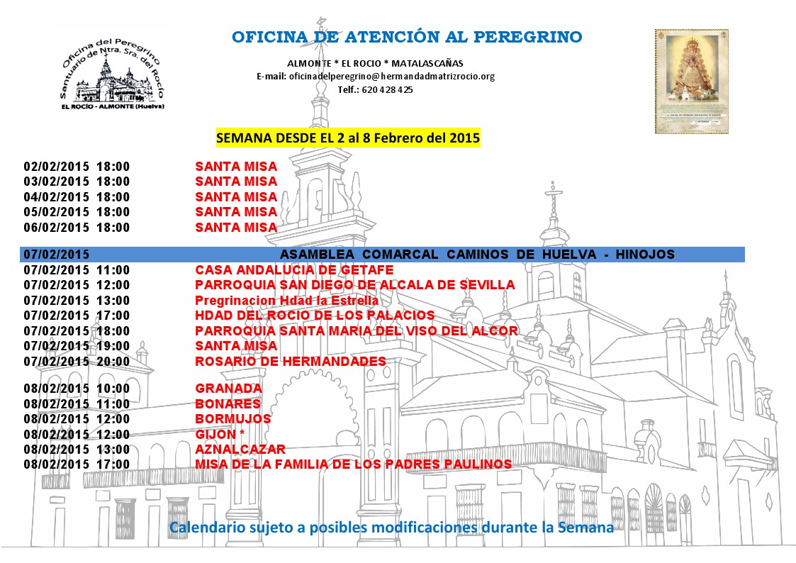 Calendario semanal de peregrinaciones al Santuario del Rocío del 2 al 8 de febrero de 2015