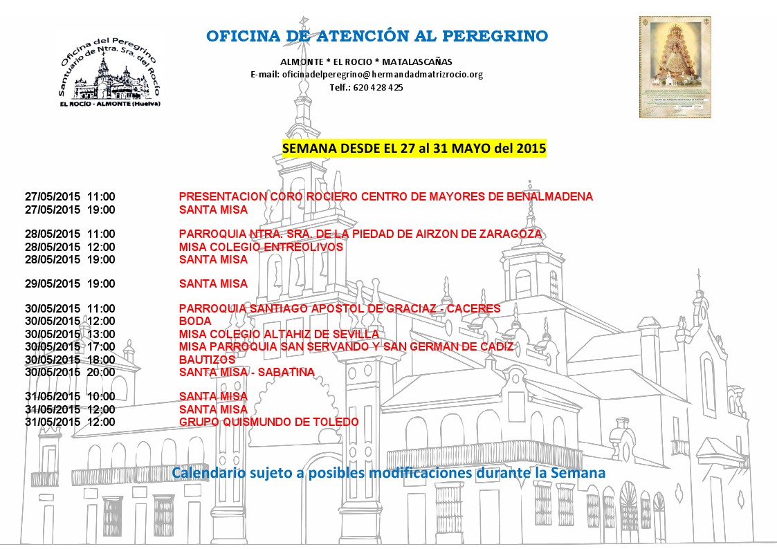 La Oficina de Atención al peregrino nos facilita el Calendario semanal de peregrinaciones al Santuario del Rocío del 27 al 31 de mayo de 2015, provisional hasta ajuste de agenda.