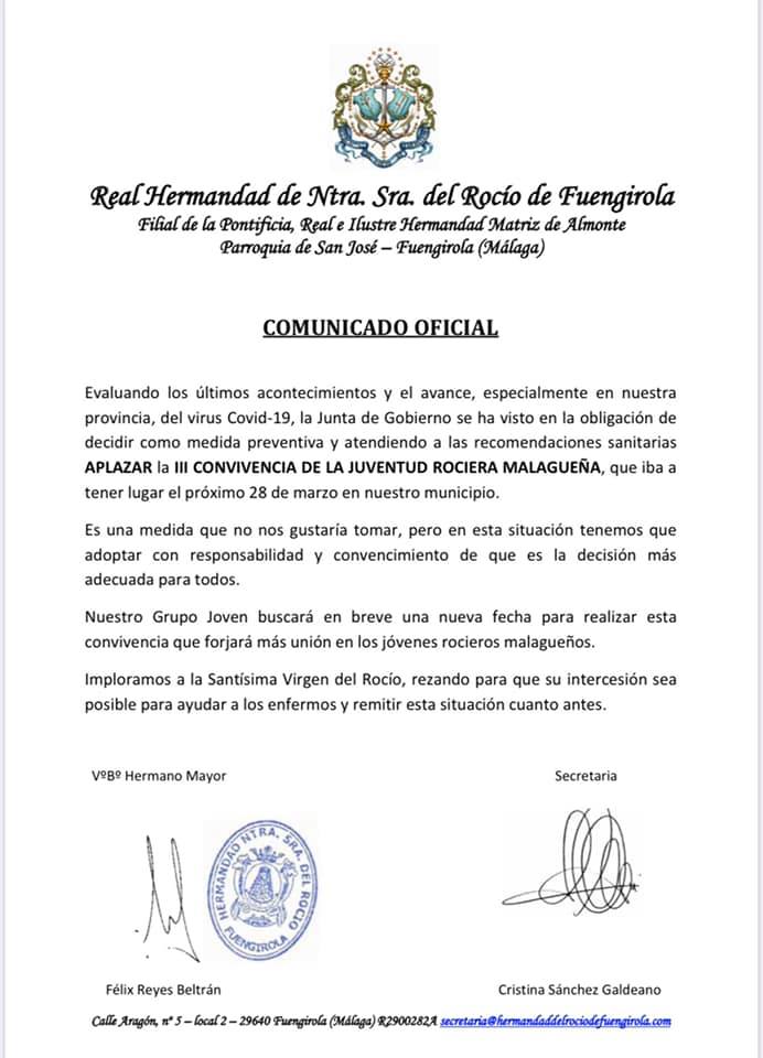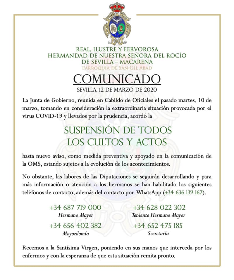 Seguimos implorando la intercesión de la Santísima Virgen del Rocío para que está pandemia se solucione cuánto antes, y todos sus efectos derivados