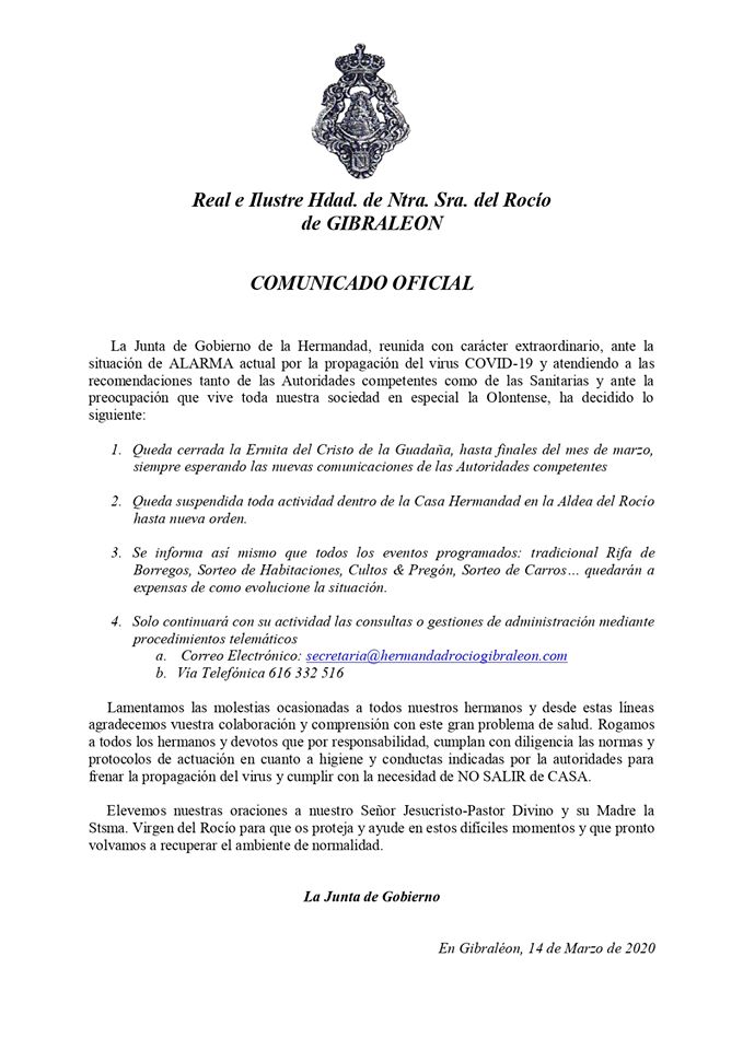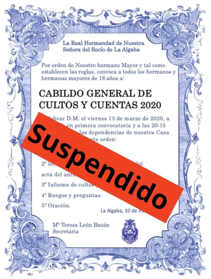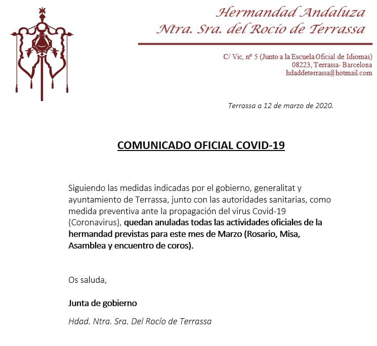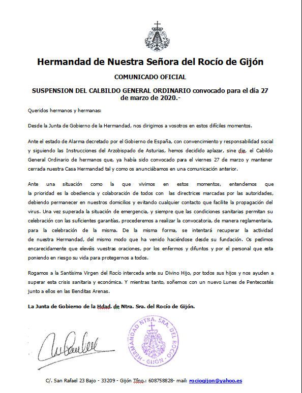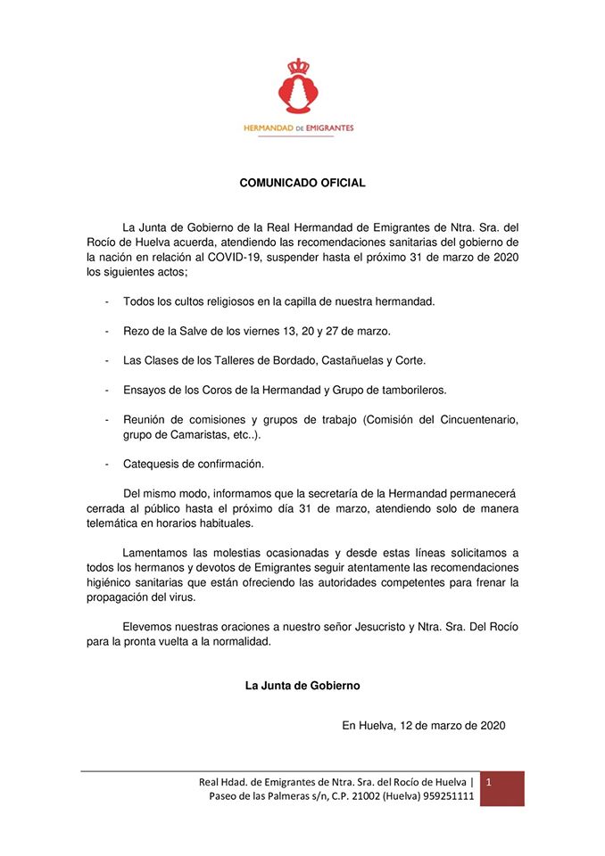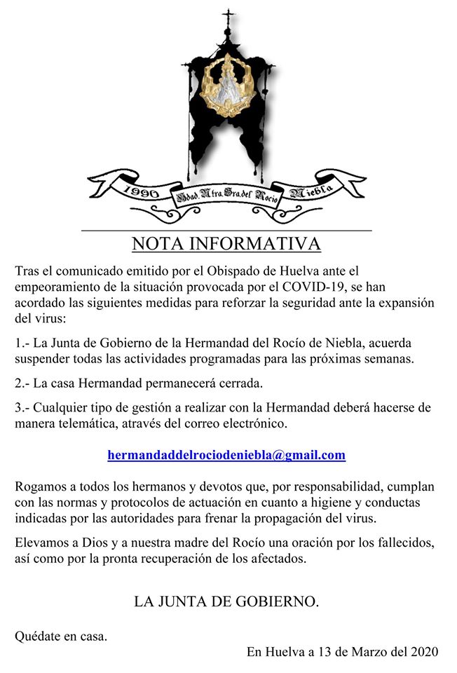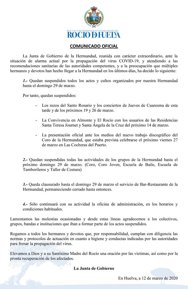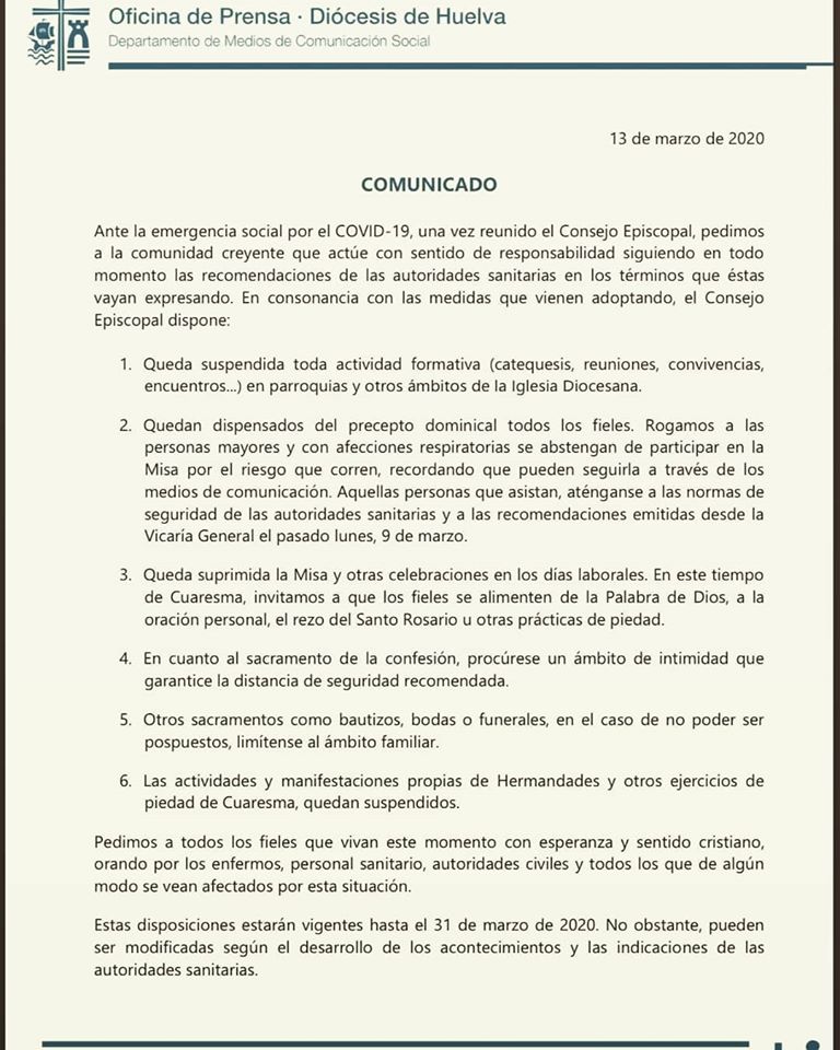 Atendiendo a las indicaciones de todas las autoridades y a la evolución de la pandemia Covid-19, nos vemos en la obligación de cerrar la Parroquia de Ntra Sra de la Asunción de Almonte, hasta que se levante el Estado de Alarma en el país, con las últimas instrucciones recibidas de las autoridades que coordinan esta crisis.