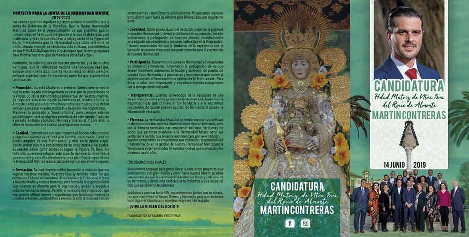 Una corporación de 18 corazones rocieros desde la cuna, cercana al Pueblo, ofreciendo una renovación verdadera, necesaria y capacitada, que adquiere con el más amplio sentido de la responsabilidad, la tarea de gestión de la Hermandad, así como la proclamación de la devoción a Nuestra Madre, La Virgen del Rocío.