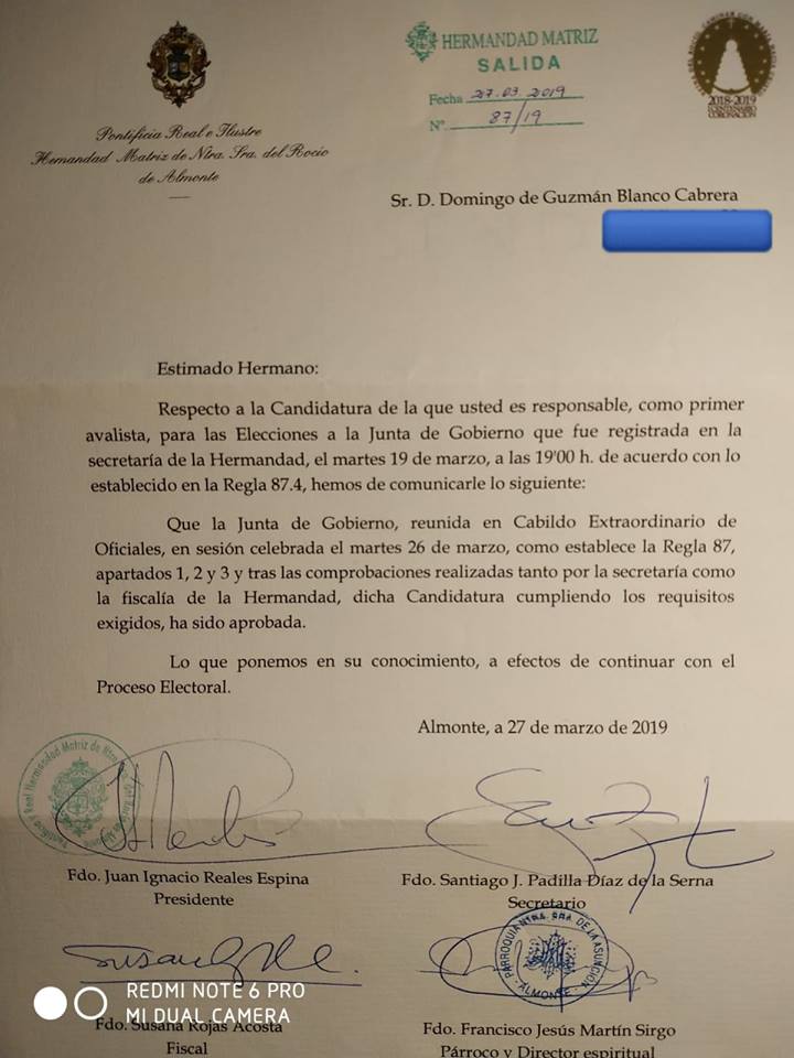 Tenemos a bien comunicaros, que se ha dado un nuevo paso al frente para consolidar nuestra candidatura, que ostentará a la Junta de Gobierno de Nuestra querida Hermandad Matriz de Almonte. En la tarde de ayer, se nos ha comunicado por escrito, por la actual Junta de Gobierno, la aprobación de nuestra candidatura y por tanto de todos los miembros que la componen, tras cumplir los requisitos exigidos en nuestros estatutos.