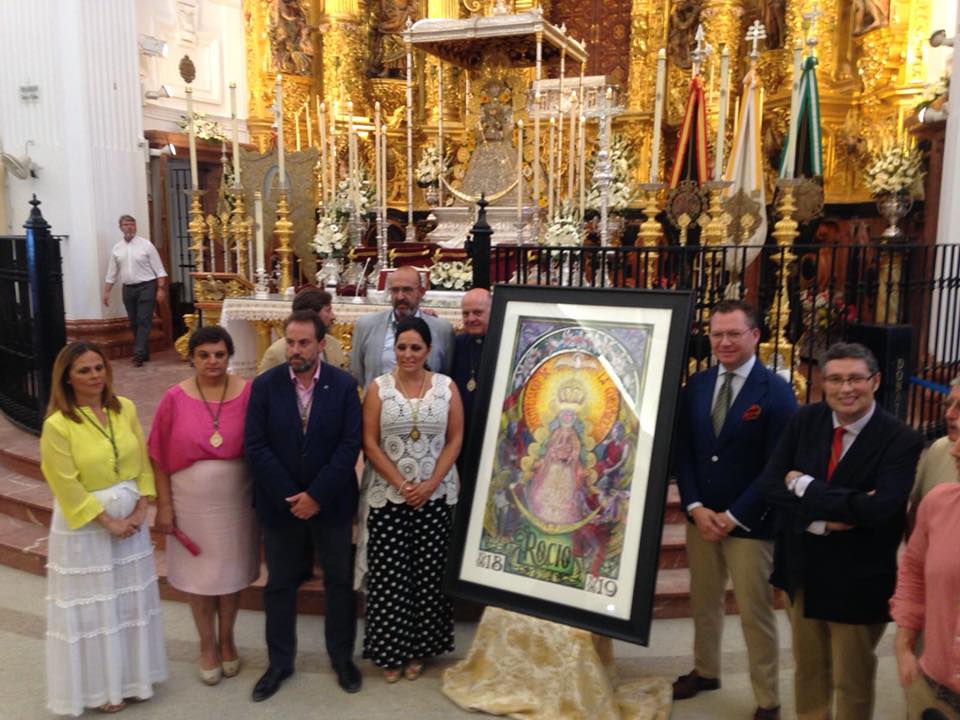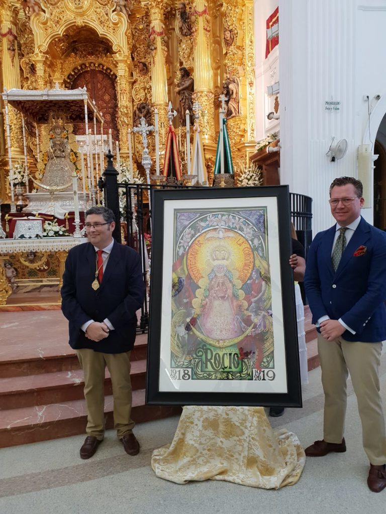 Acaba de presentarse en el Santuario el cartel anunciador del Centenario de la Coronación Canónica de la Virgen del Rocío, obra del artista nazareno Juan Miguel Martín Mena.