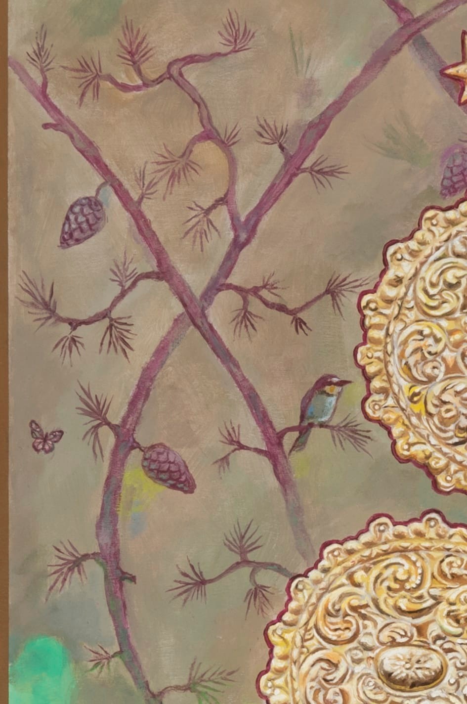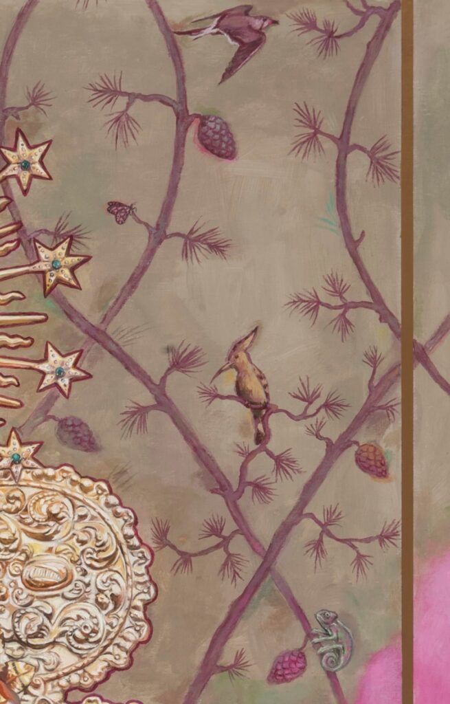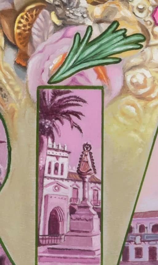 En la parte inferior, destacan en la composición dos leones que custodian la palabra “Rocío”. Dos elementos ornamentales que también podemos ver repujados en el paso de la Virgen y que simbolizan a los almonteños como “Leones del Amor” y fieles custodios de la devoción a la Blanca Paloma.