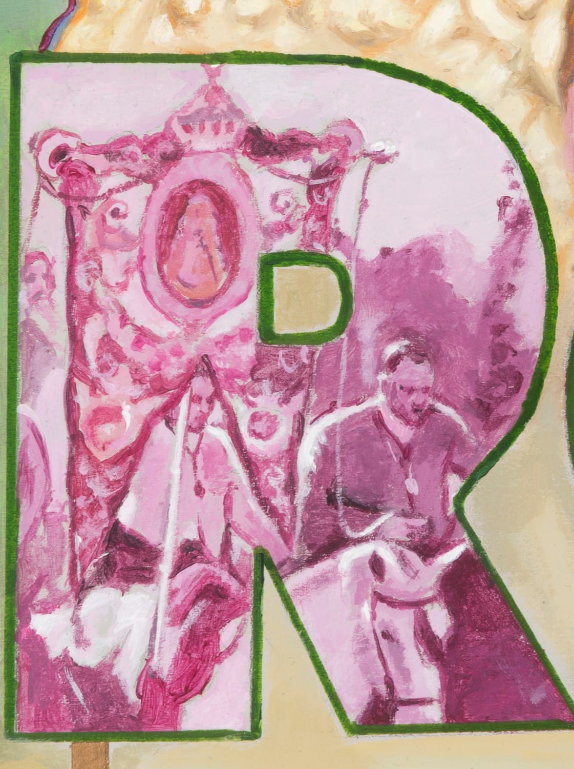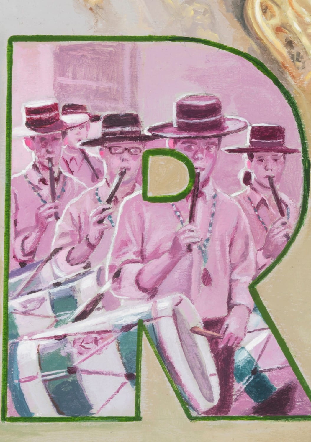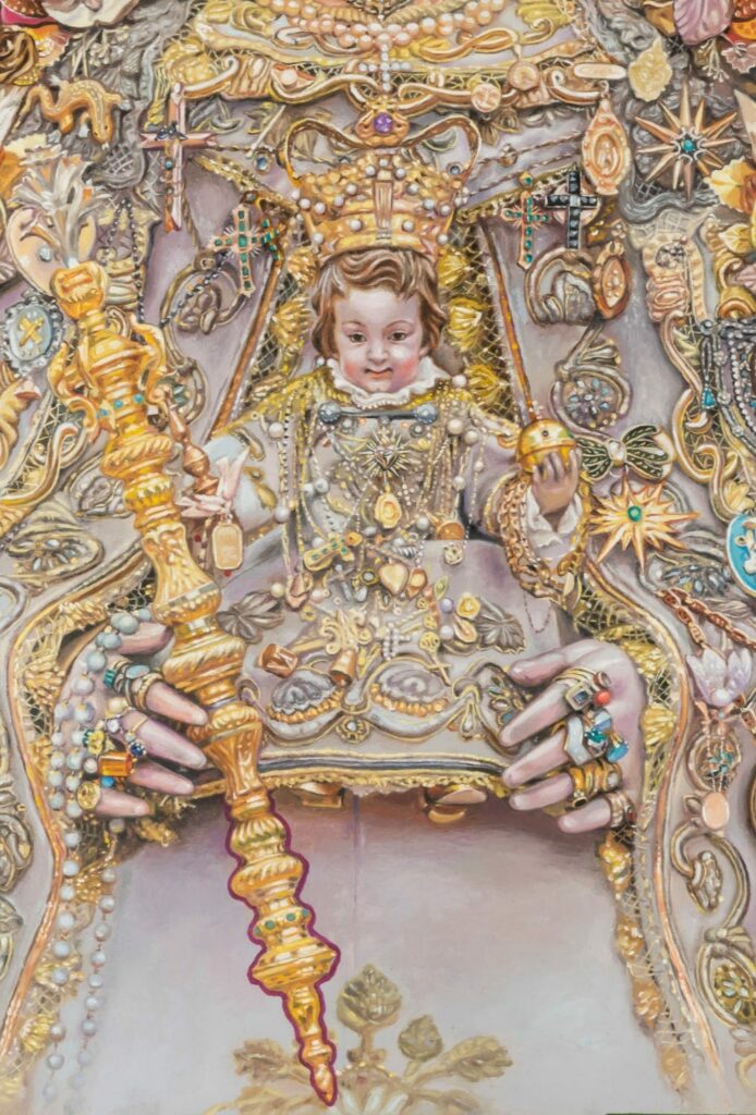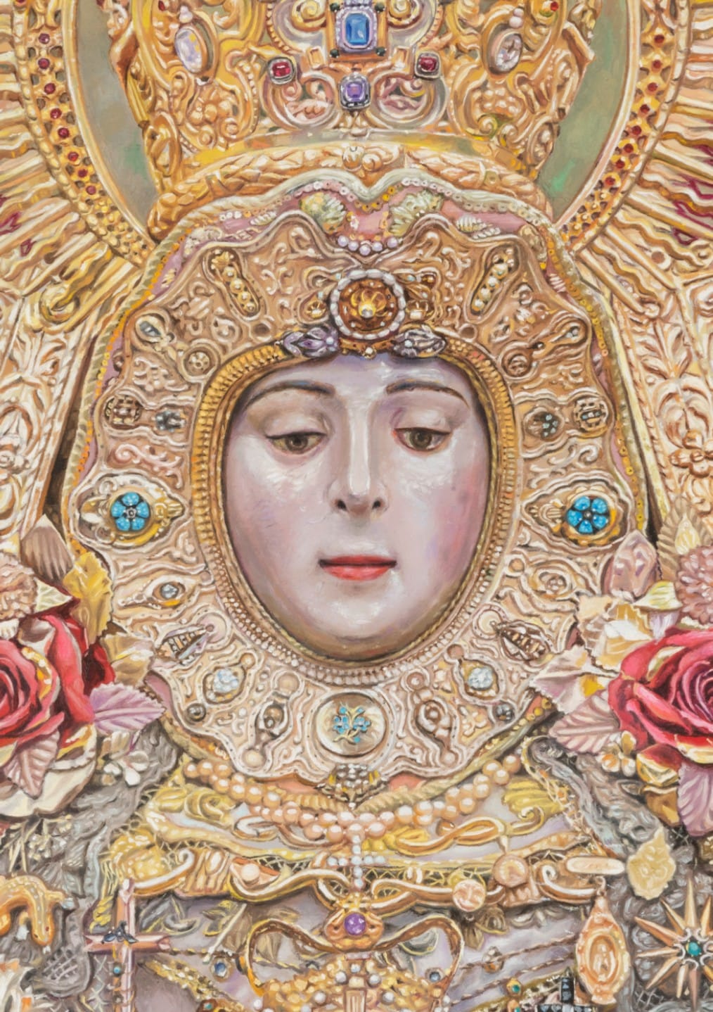 Flanquea a la Patrona de Almonte la mágica luz que desprenden las bengalas del Santo Rosario que antecede su salida triunfal, a hombros de los almonteños. Justo a sus plantas, la palabra “Romería”, esa que tanto anhelamos, contiene en cada letra escenas de la misma: el simpecado de la Matriz a caballo, el discurrir de las carretas, los peregrinos, los sones de los tamborileros, el monumento del Real del Rocío y el Santuario.