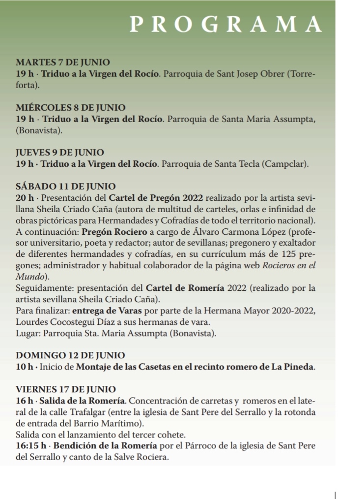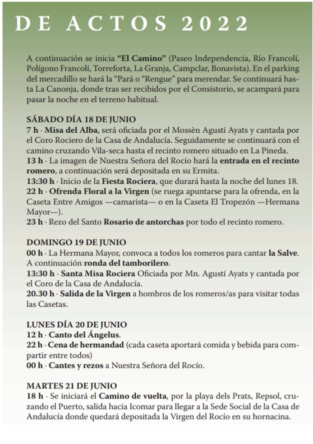 Un año más, desde Tarragona, La Casa de Andalucía de Tarragona y Provincia, empezamos los preparativos para iniciar nuestra Romería en Honor a Ntra Sra. Del Rocío, siendo la segunda Romería más antigua y multitudinaria de Cataluña, acompañándonos más de 4000 romeros durante el camino, aún estando lejos, nos sentimos muy cerca de Ella.