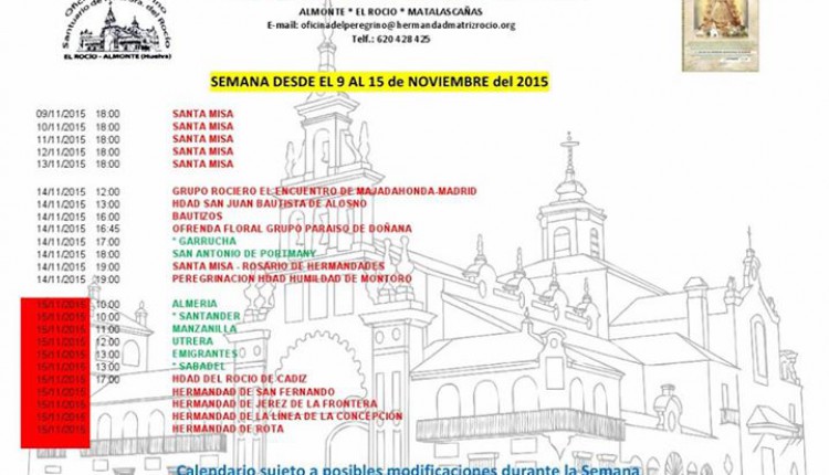 Calendario de Celebraciones en el Santuario del Rocío del 21 al 27 de noviembre de 2016
