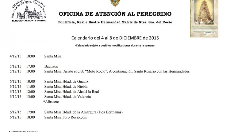 Calendario de Celebraciones en el Santuario de El Rocío del 5 al 11 de diciembre 2016