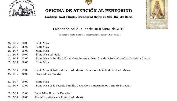 Calendario de Celebraciones en el Santuario del Rocio del 19 al 25 de diciembre 2016