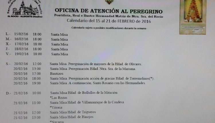 Calendario de Celebraciones en el Santuario del Rocio del 20 al 26 de febrero de 2017