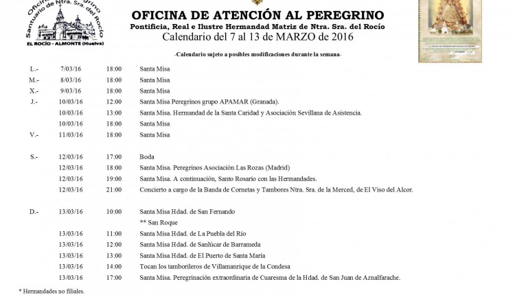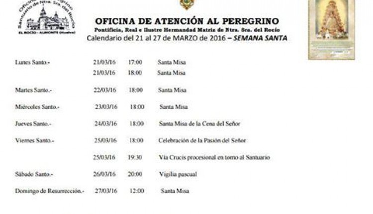 Calendario de Celebraciones en el Santuario del Rocío del 26 de febrero al 5 de marzo de 2017
