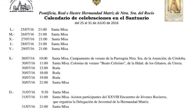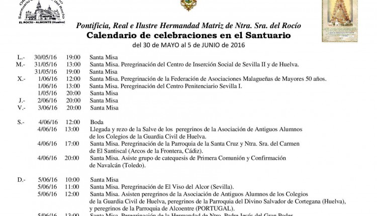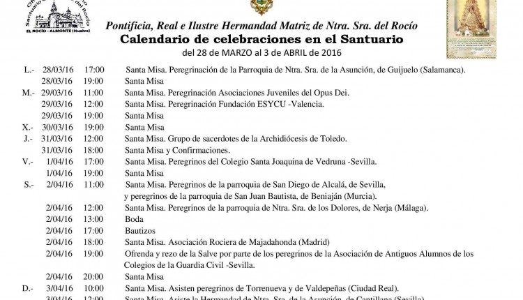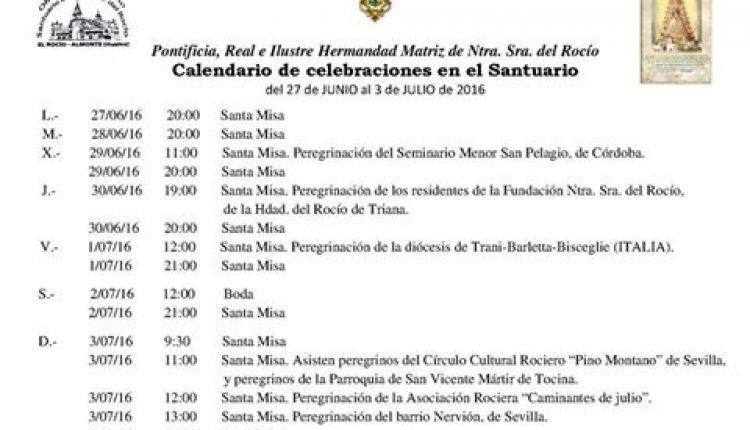 Calendario de Celebraciones en el Santuario del Rocío del 26 de septiembre al 2 de octubre de 2016