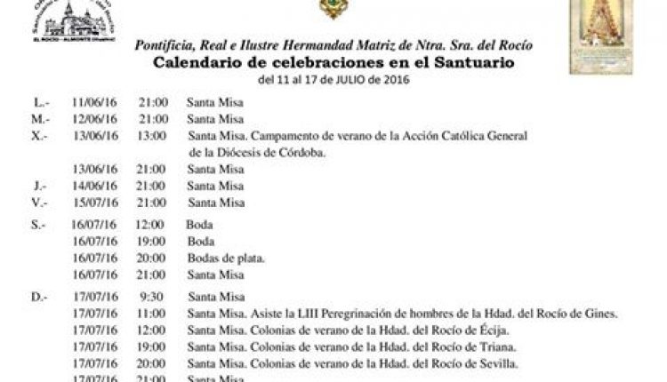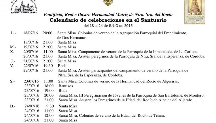 Calendario de Celebraciones en el Santuario del Rocío del 12 al 18 de septiembre de 2016
