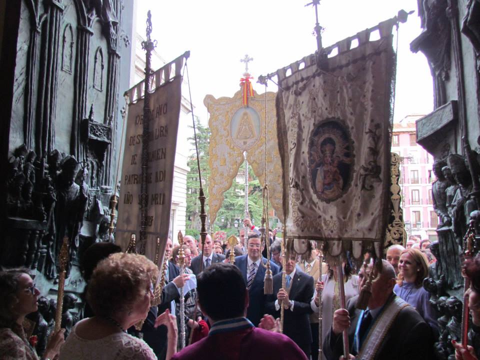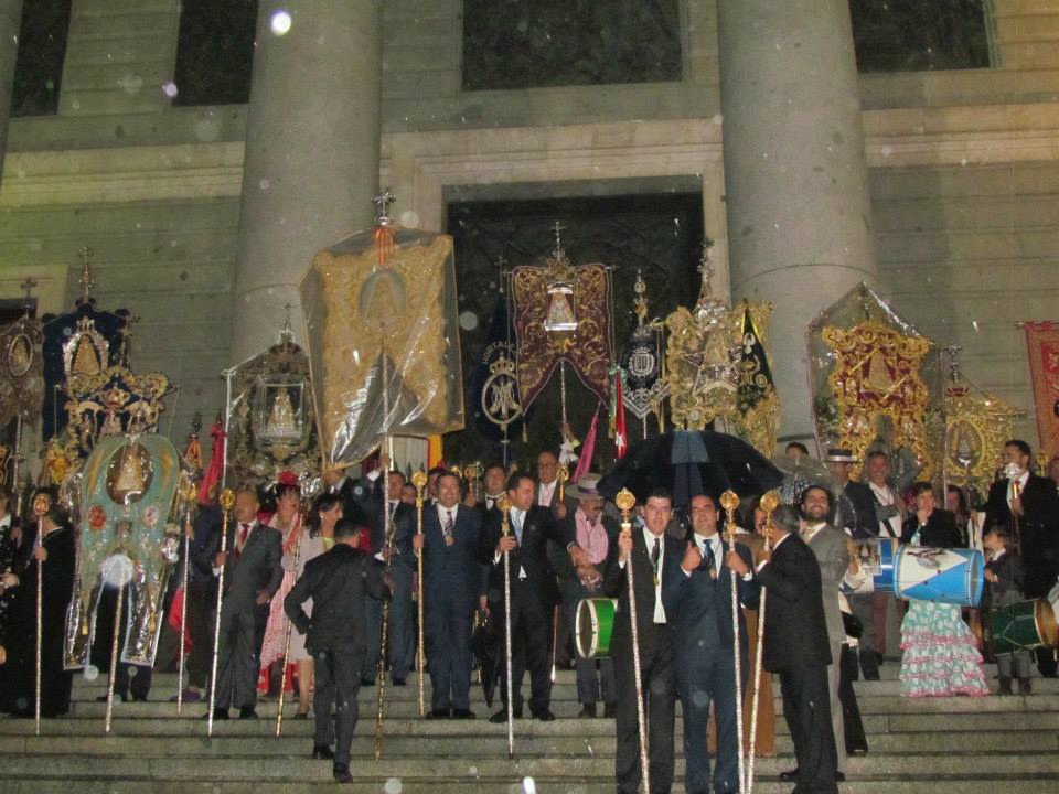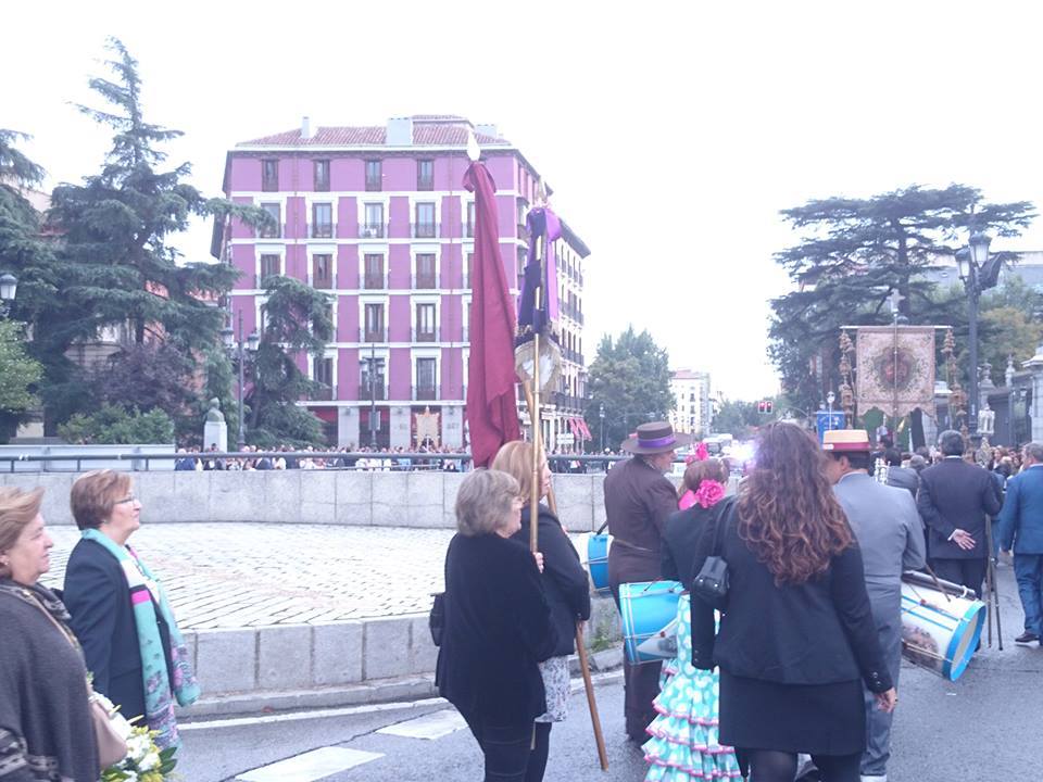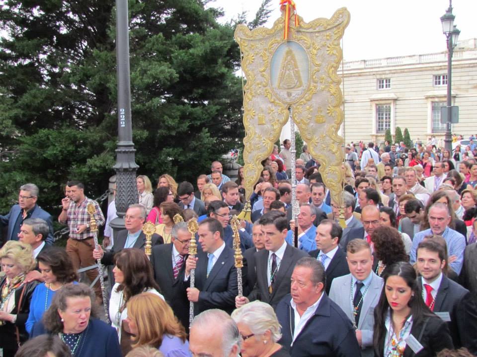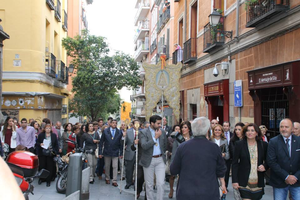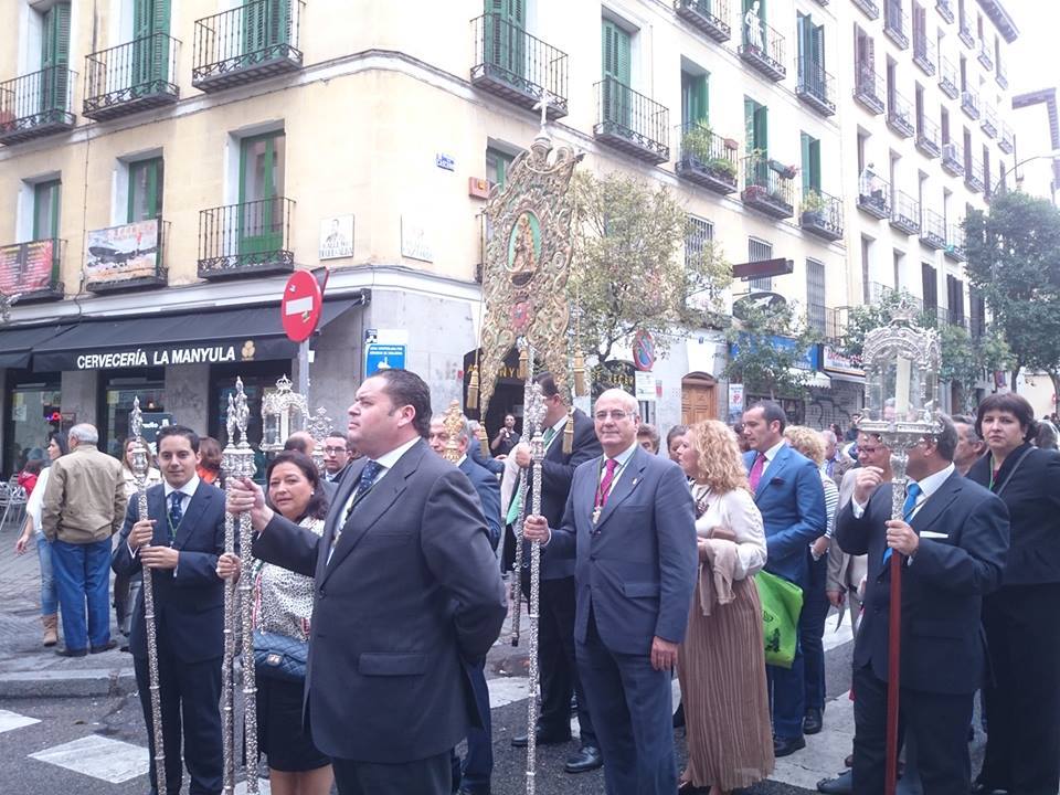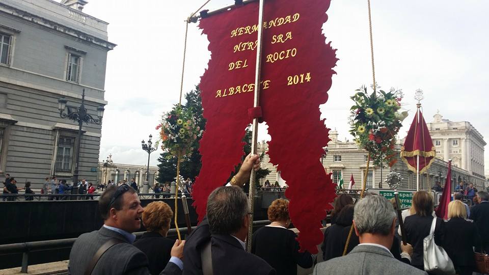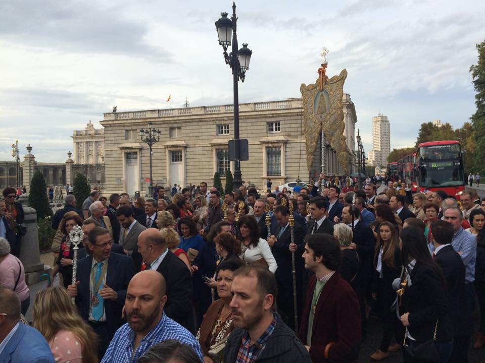 A las 17 h, se iniciará el rezo del Santo Rosario y dará comienzo la Magna Procesión hasta la Santa Iglesia Catedral de Sta. María la Real de la Almudena, con los Simpecados e insignias de las Hddes. participantes, por riguroso orden, por las calles del Madrid de los Austrias, dando público testimonio de nuestra devoción a la Santísima Virgen María en la preciosa advocación del Rocío, en acción de gracias por los frutos del Año Jubilar, y haciendo del Rocío, un «camino de Esperanza”, según las indicaciones de S.S. el Papa Francisco, que invita a salir para dar testimonio de una esperanza que no defrauda.
