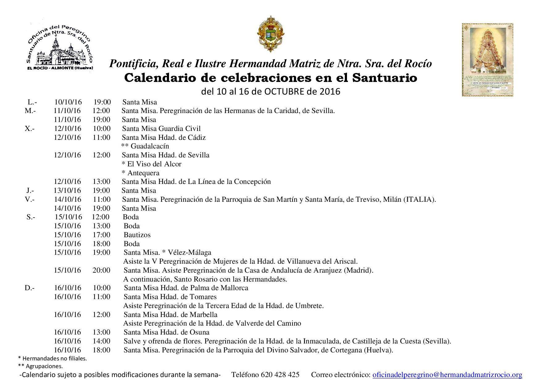 Calendario de Celebraciones en el Santuario del Rocío del 10 al 16 de octubre de 2016