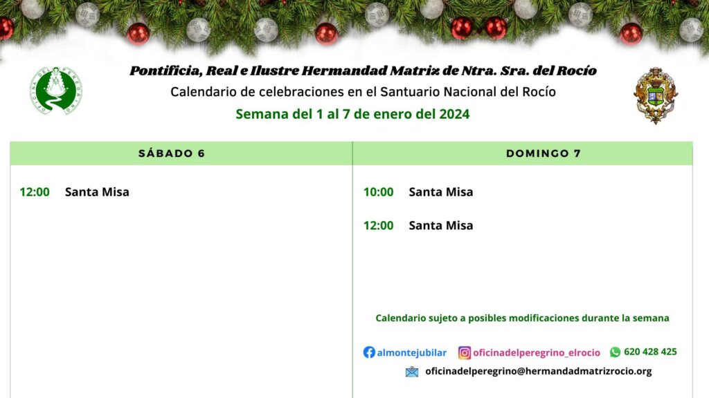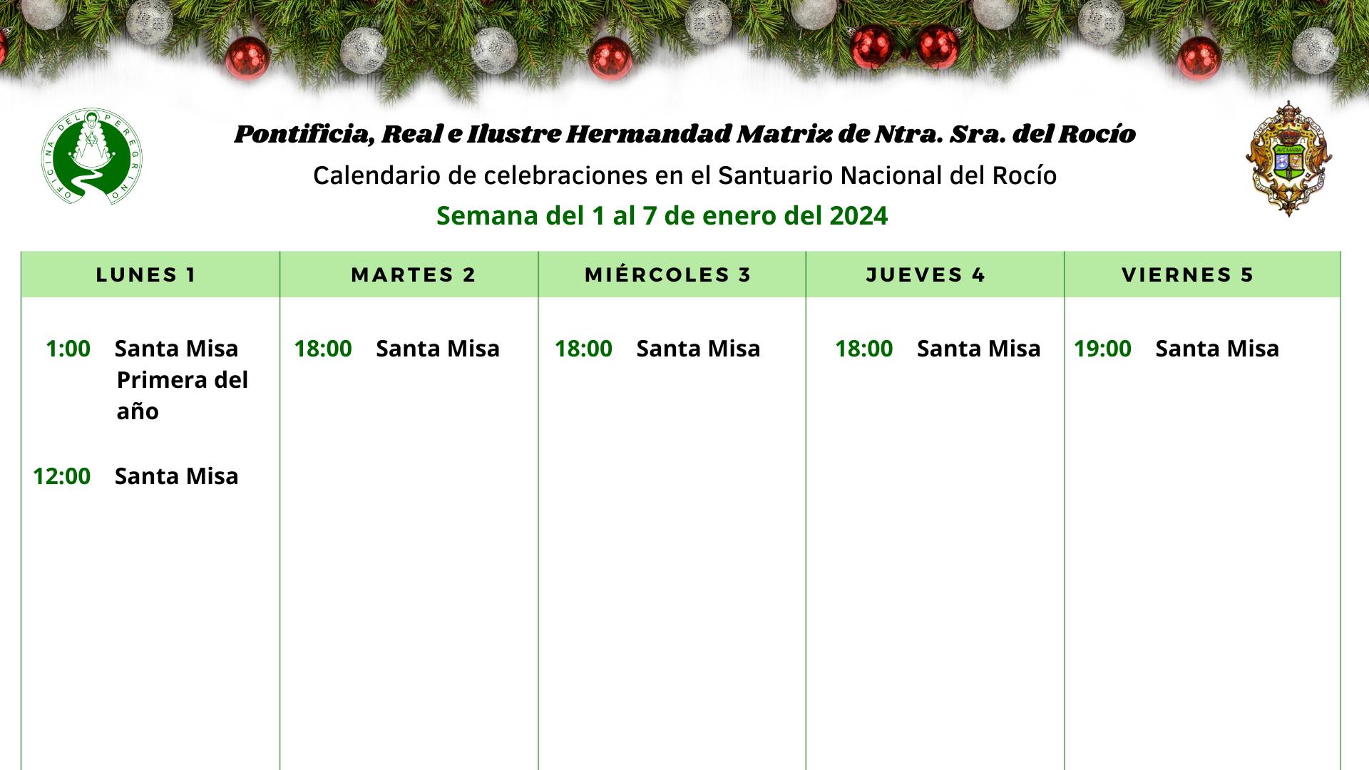 Celebraciones para la semana del 1 al 7 de enero de 2024, en el Santuario de Ntra. Sra. del Rocío.