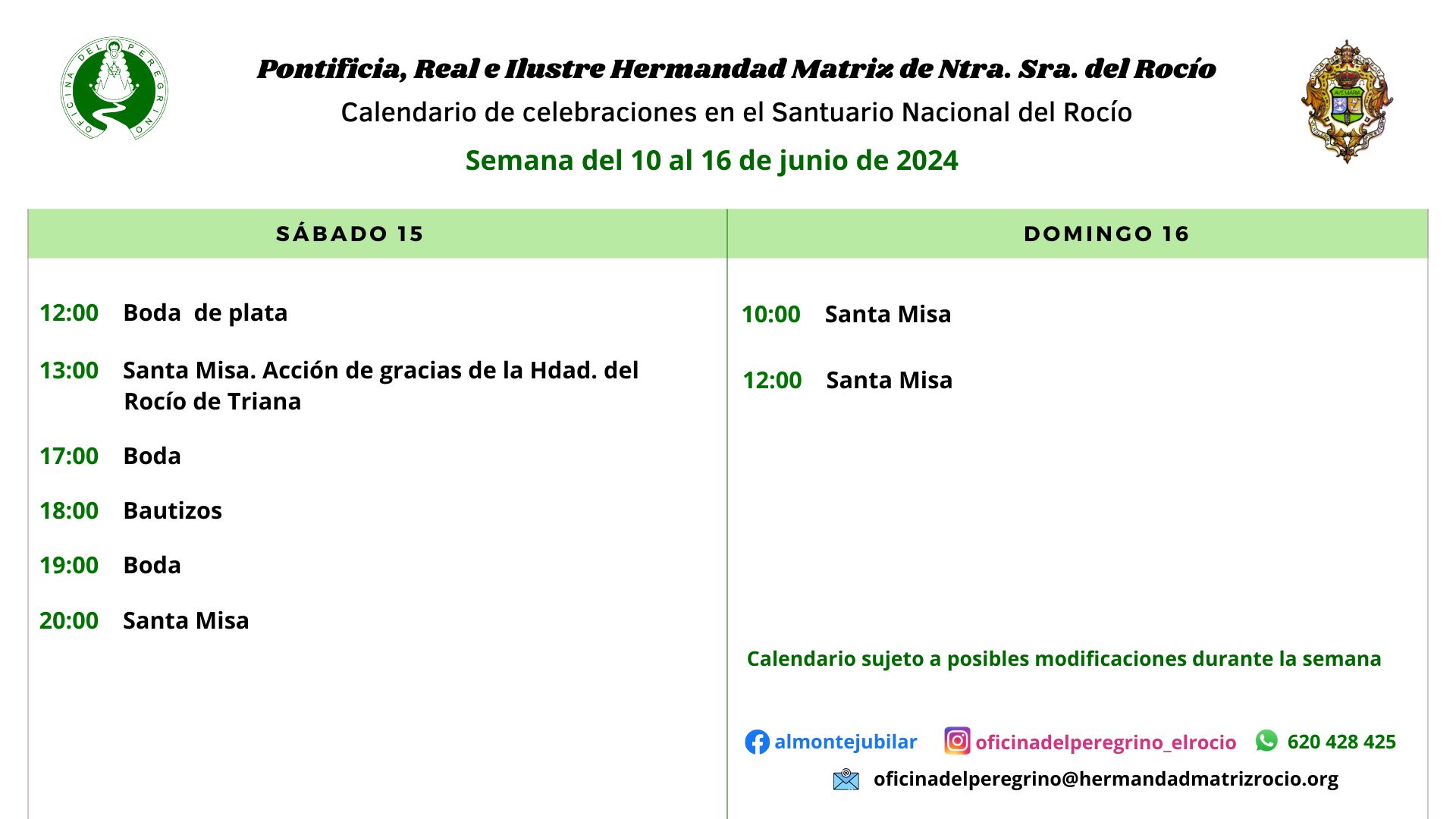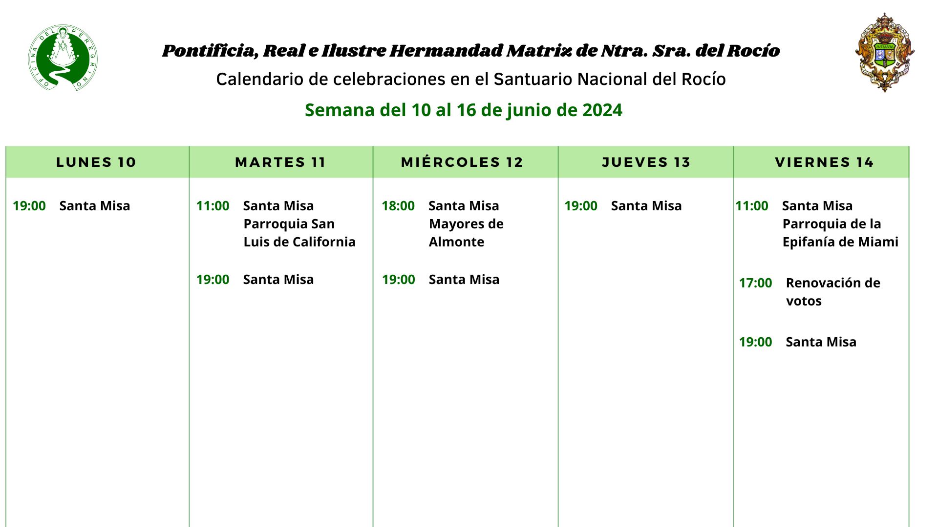 Calendario de celebraciones para la semana del 10 al 16 de junio, en el Santuario de Ntra. Sra. del Rocío.