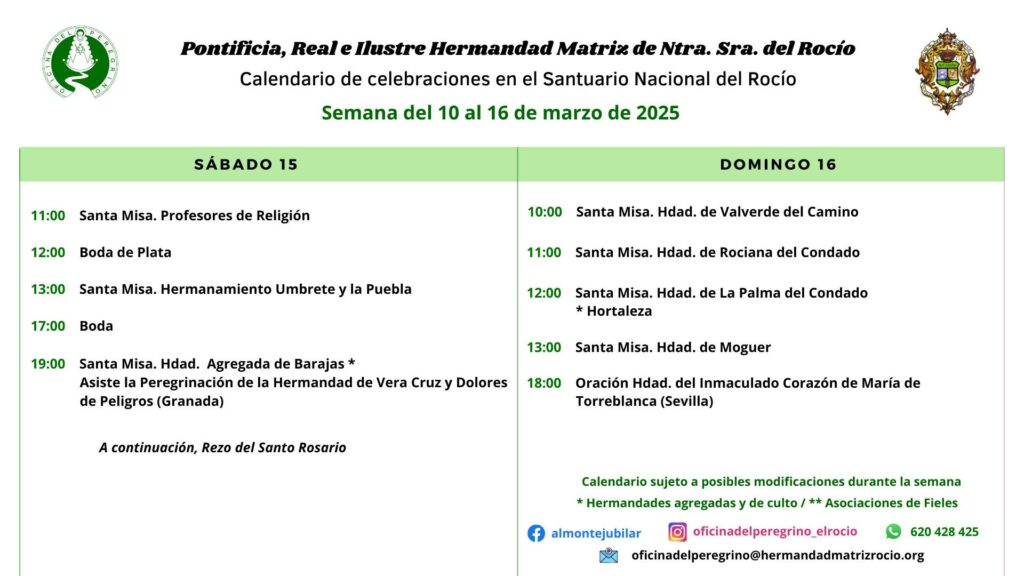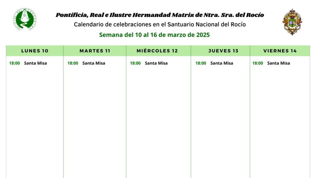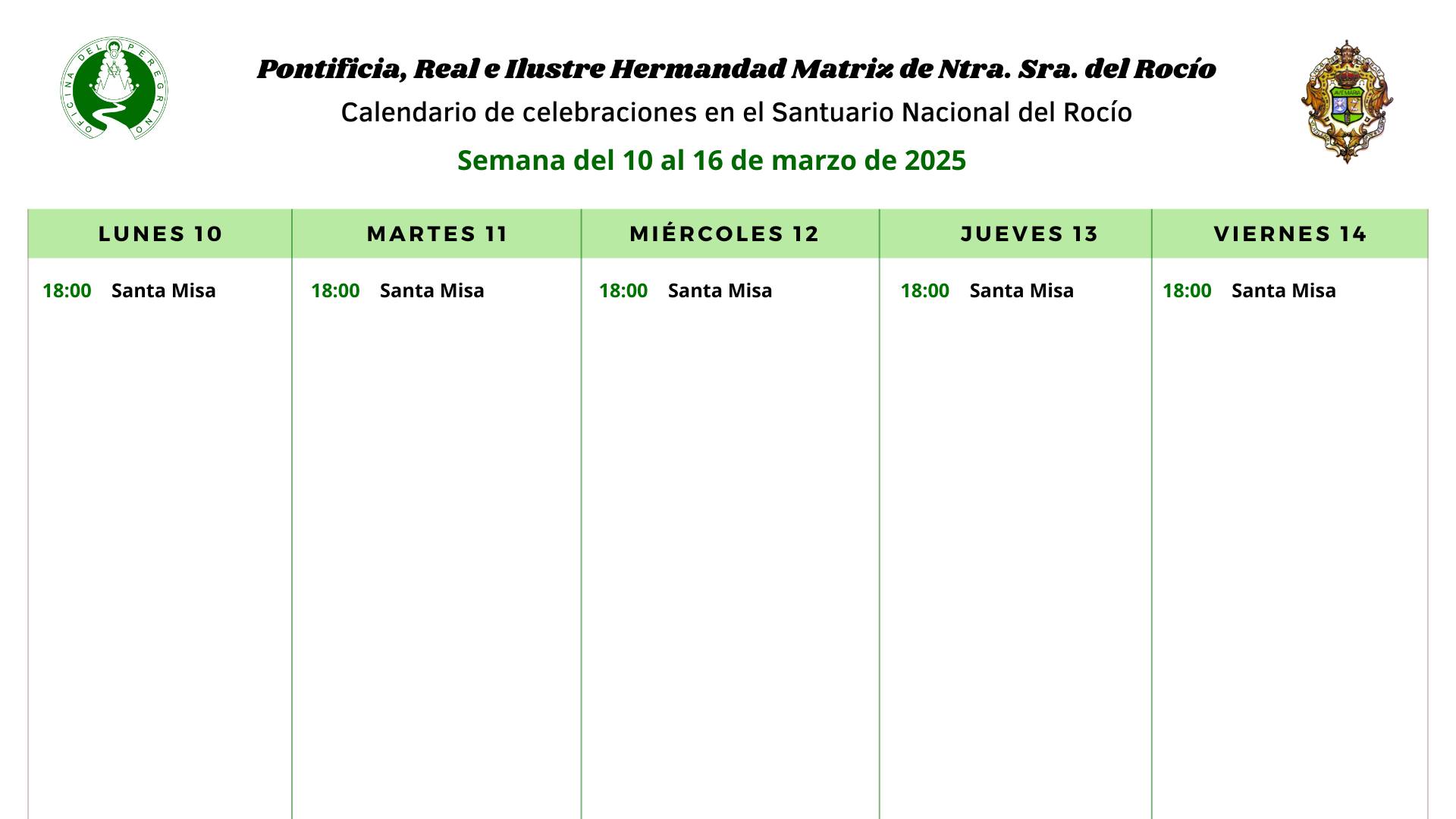 Calendario de celebraciones para la semana del 10 al 16 de marzo de 2025 en el Santuario de Ntra. Sra. del Rocío.