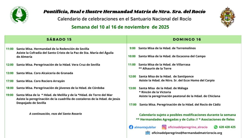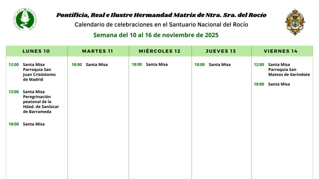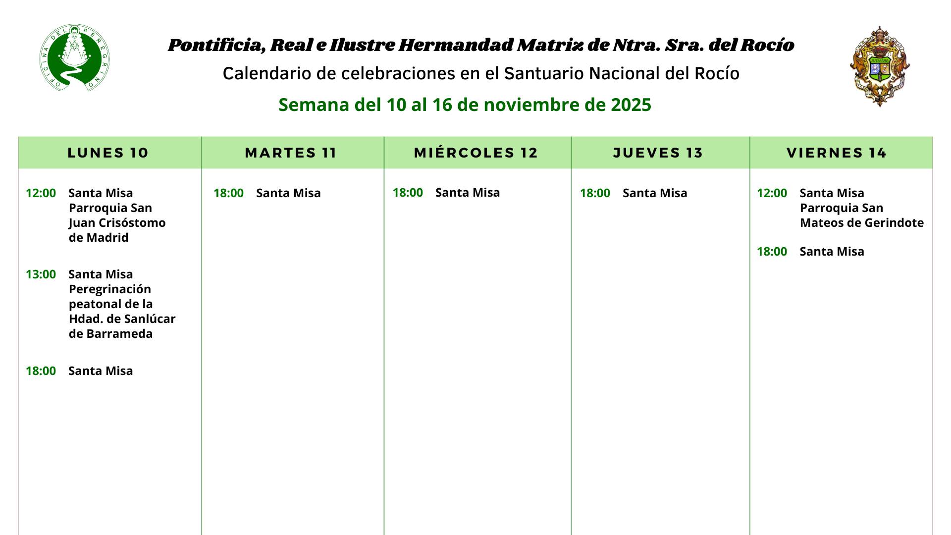 Celebraciones para la semana del 10 al 16 de noviembre de 2025 en el Santuario de Ntra. Sra. del Rocío