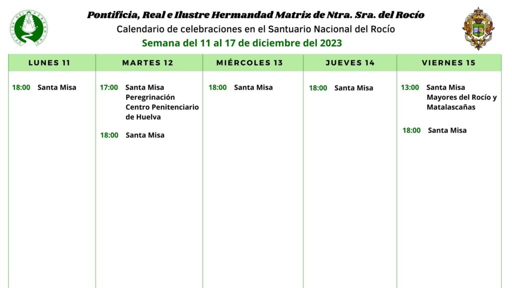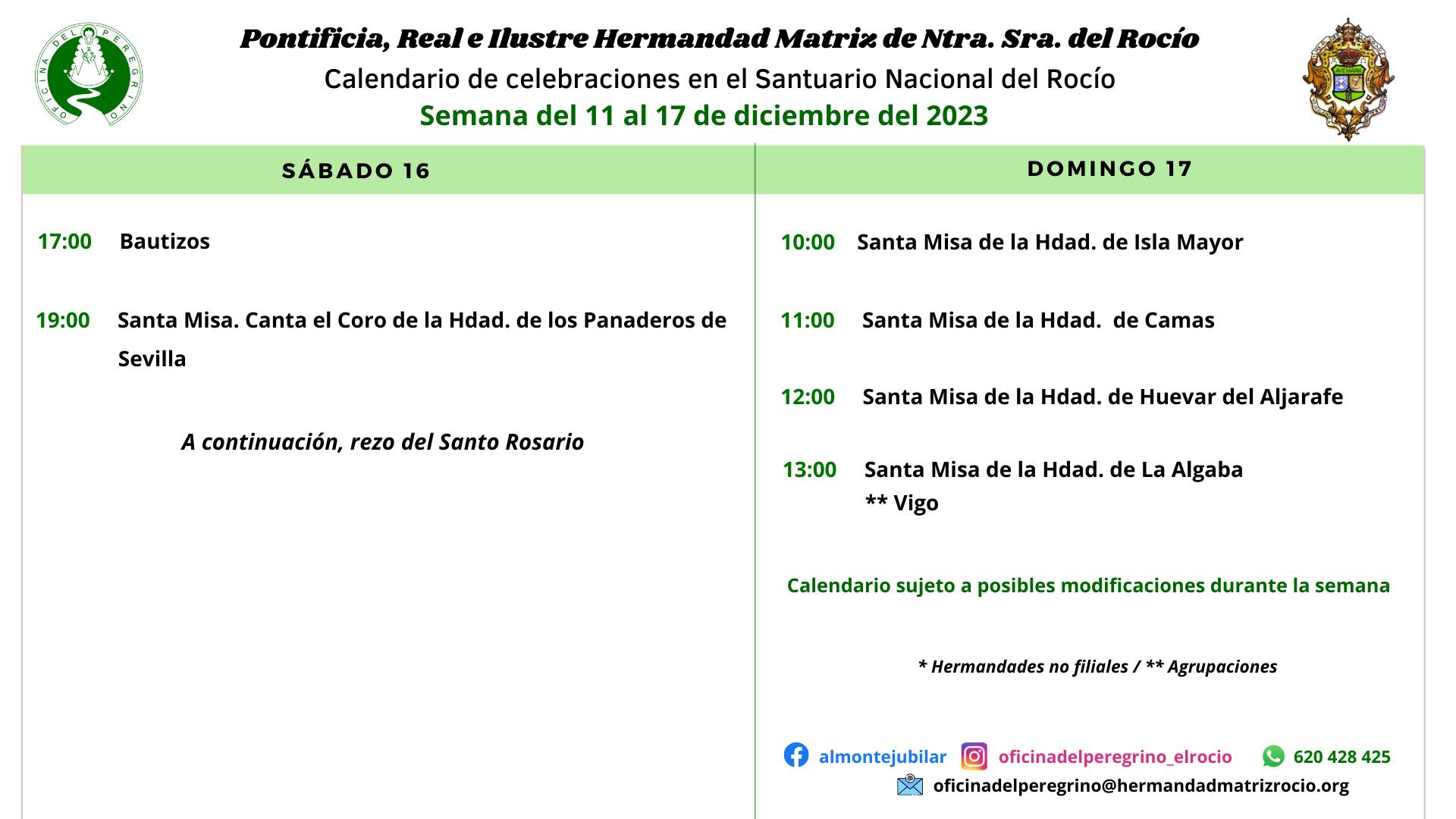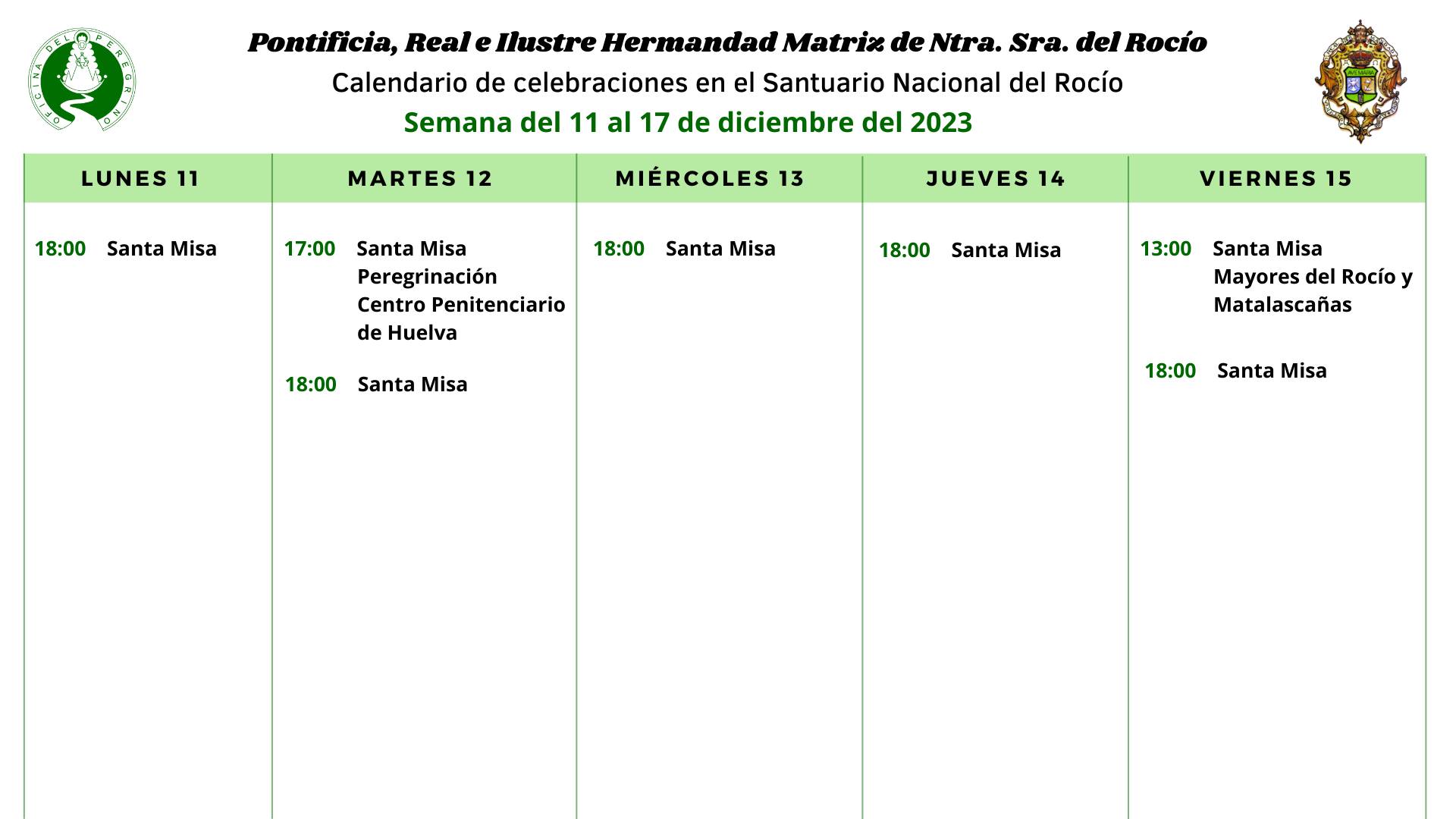 Calendario de celebraciones para la semana del 11 al 17 de diciembre, en el Santuario de Ntra. Sra. del Rocío.