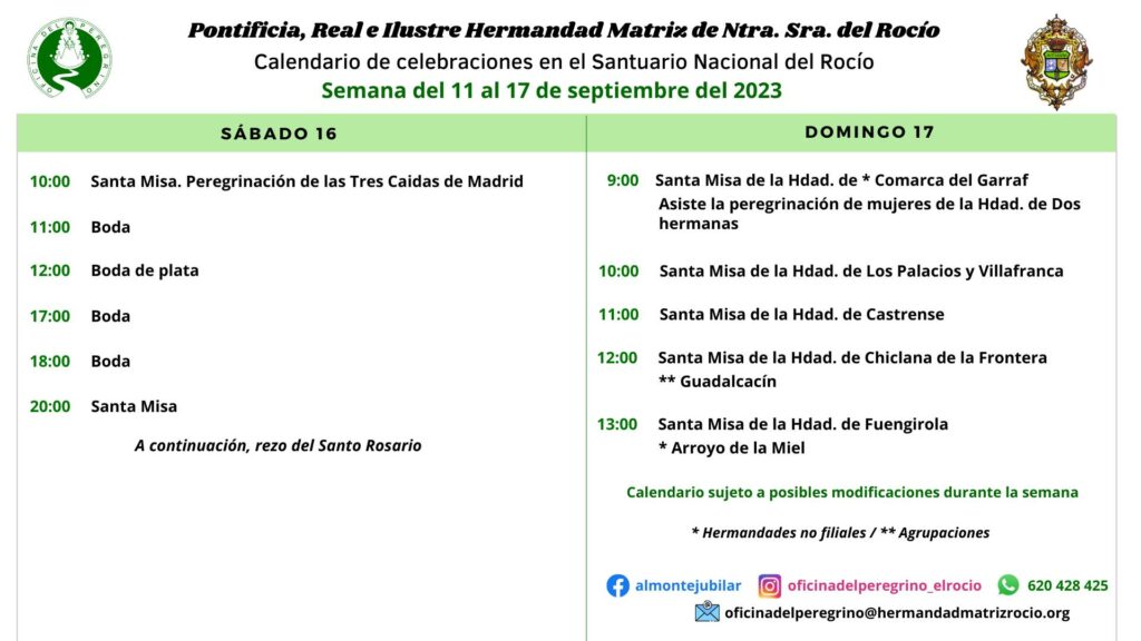 Calendario de celebraciones para la semana del 11 al 17 de septiembre, en el Santuario de Ntra. Sra. del Rocío.