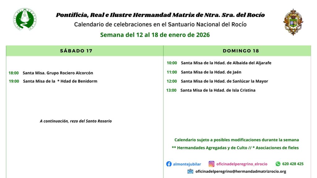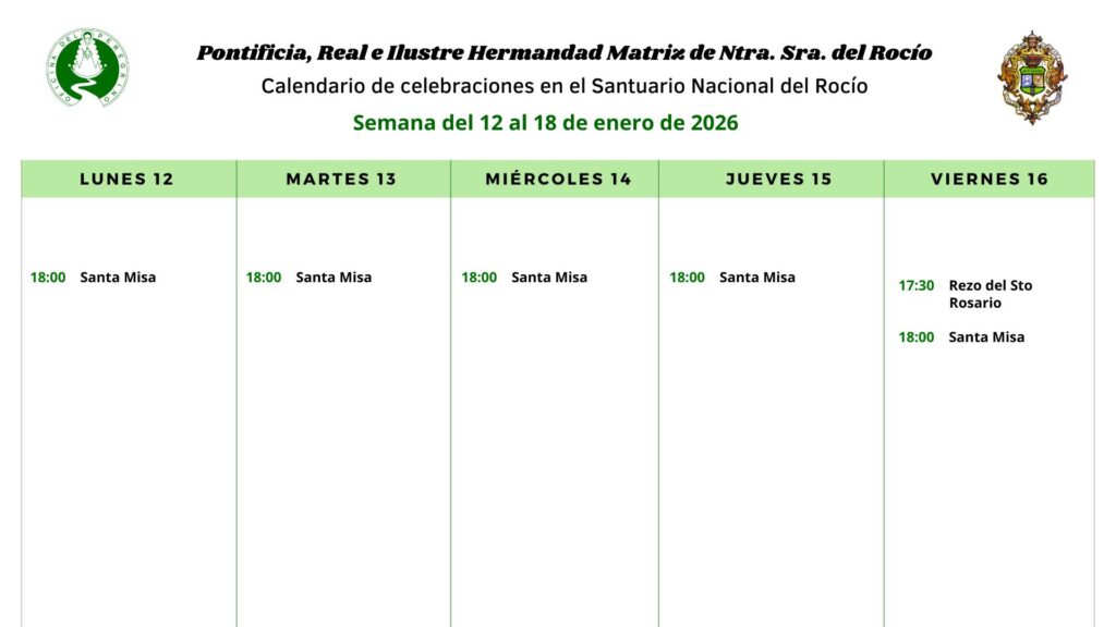 Celebraciones para la semana del 12 al 18 de enero de 2026 en el del Rocio.