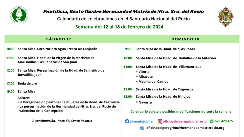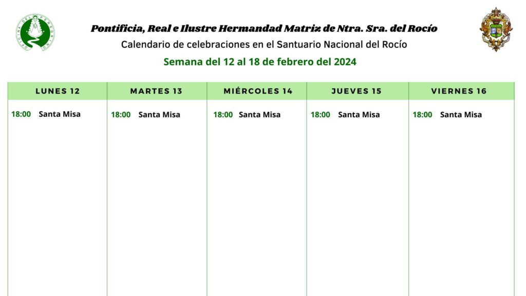 Calendario de celebraciones para la semana del 12 al 18 de febrero, en el Santuario de Ntra. Sra. del Rocío.