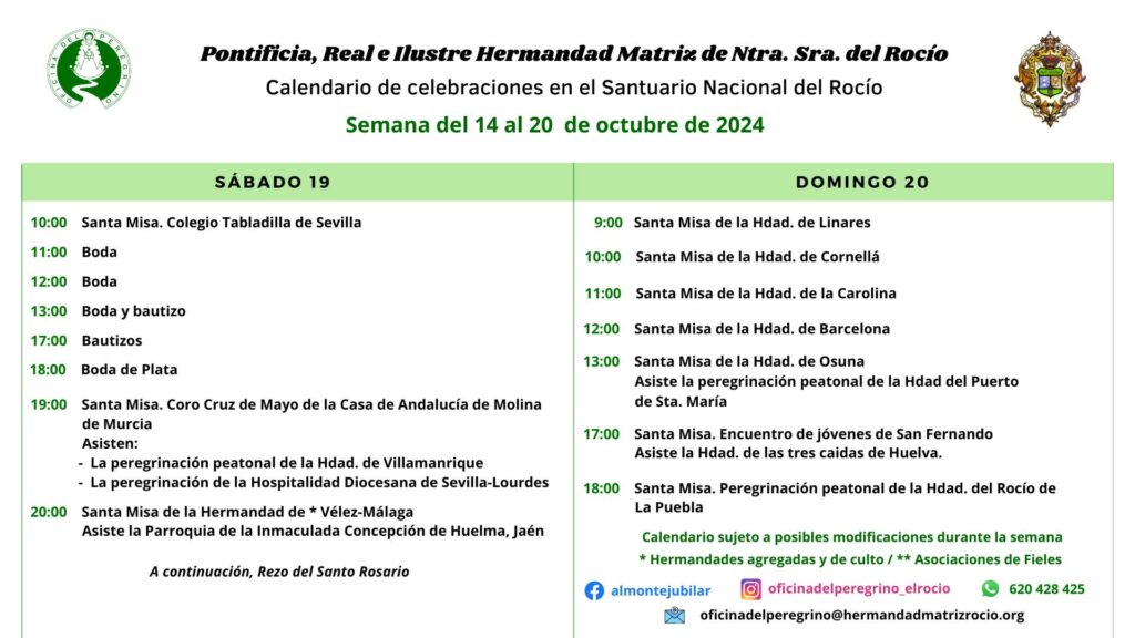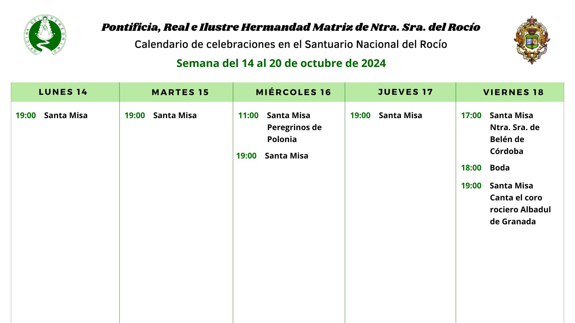 Calendario de celebraciones para la semana del 14 al 20 de octubre en el Santuario de Ntra. Sra. del Rocío.