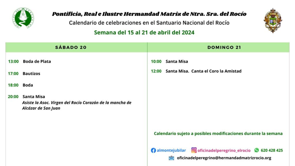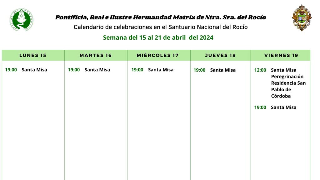 Calendario de celebraciones para la semana del 15 al 21 de abril, en el Santuario de Ntra. Sra. del Rocío.