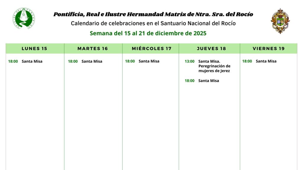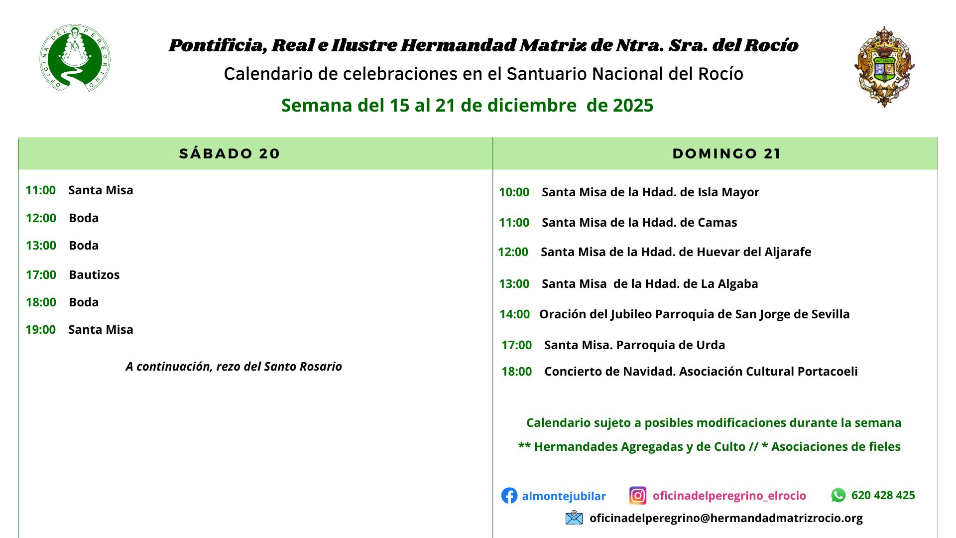 Celebraciones para la semana del 15 al 21 de diciembre de 2025 en el Rocío.