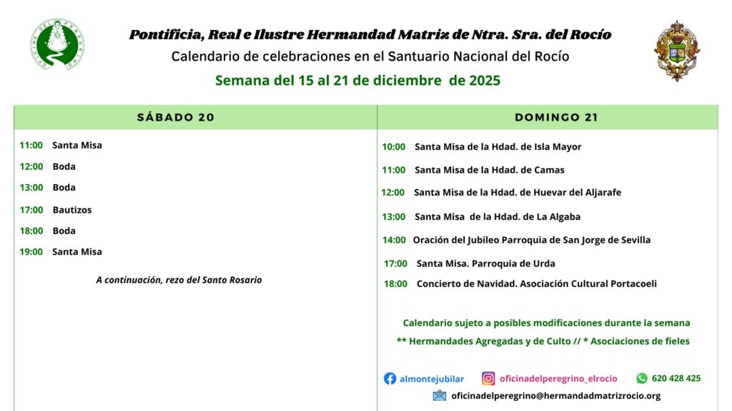 Celebraciones para la semana del 15 al 21 de diciembre de 2025 en el Rocío