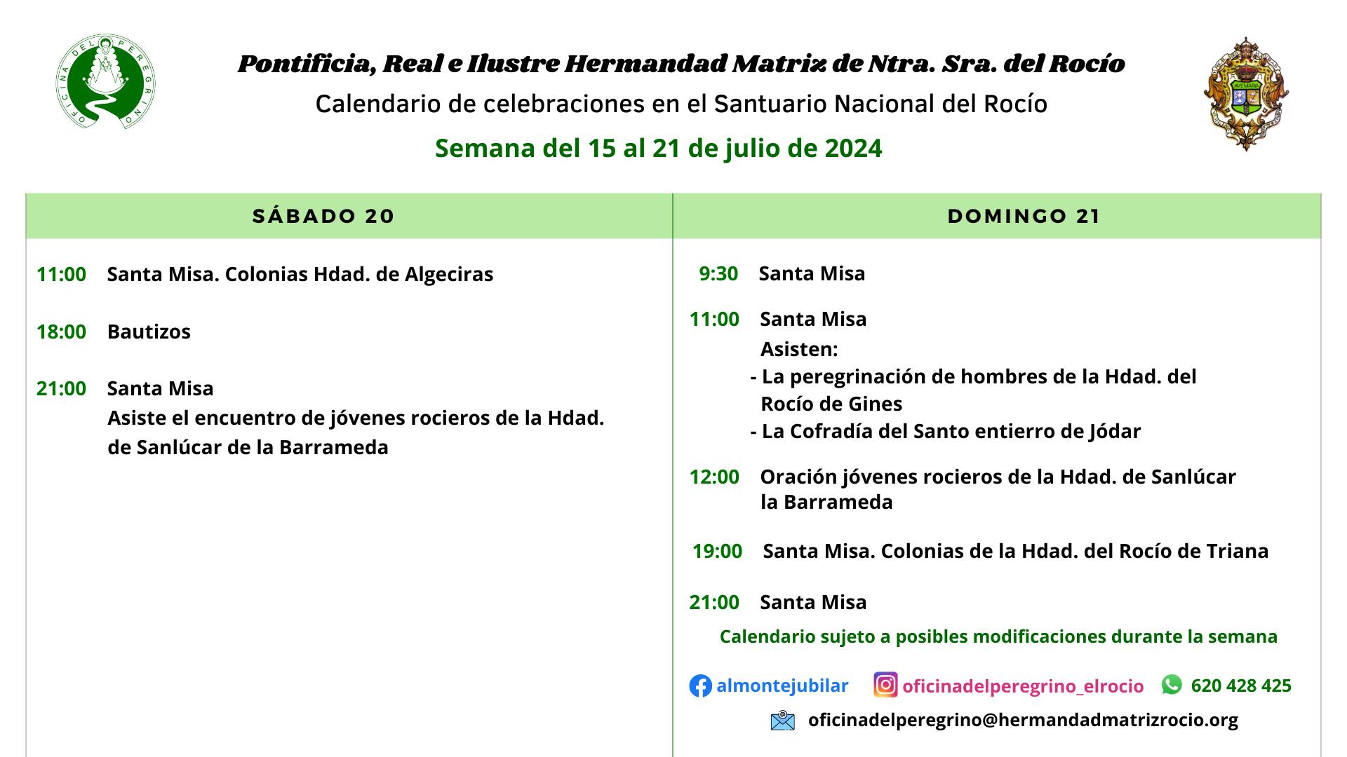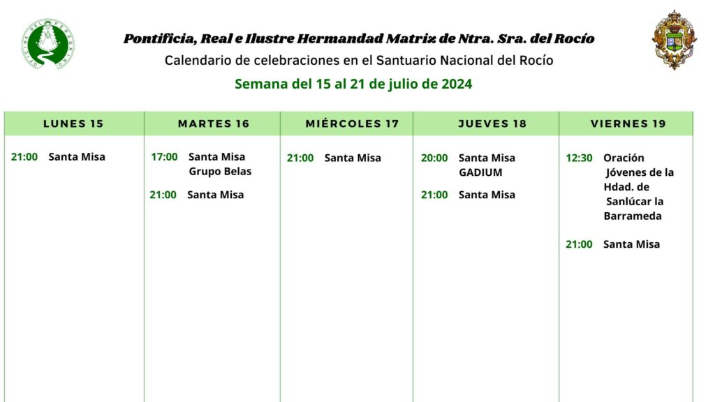 Calendario de celebraciones para la semana del 15 al 21 de julio, en el Santuario de Ntra. Sra. del Rocío.