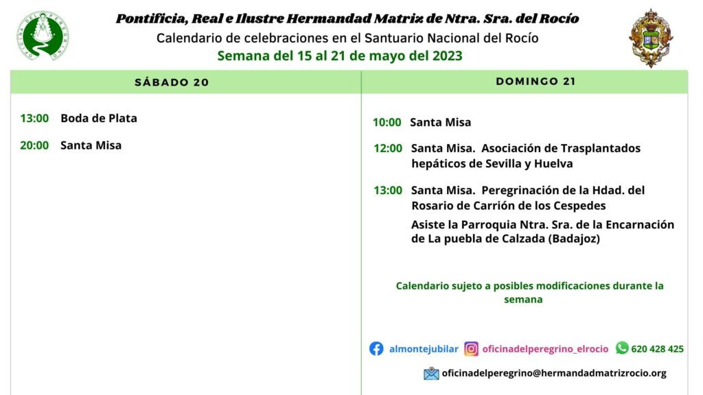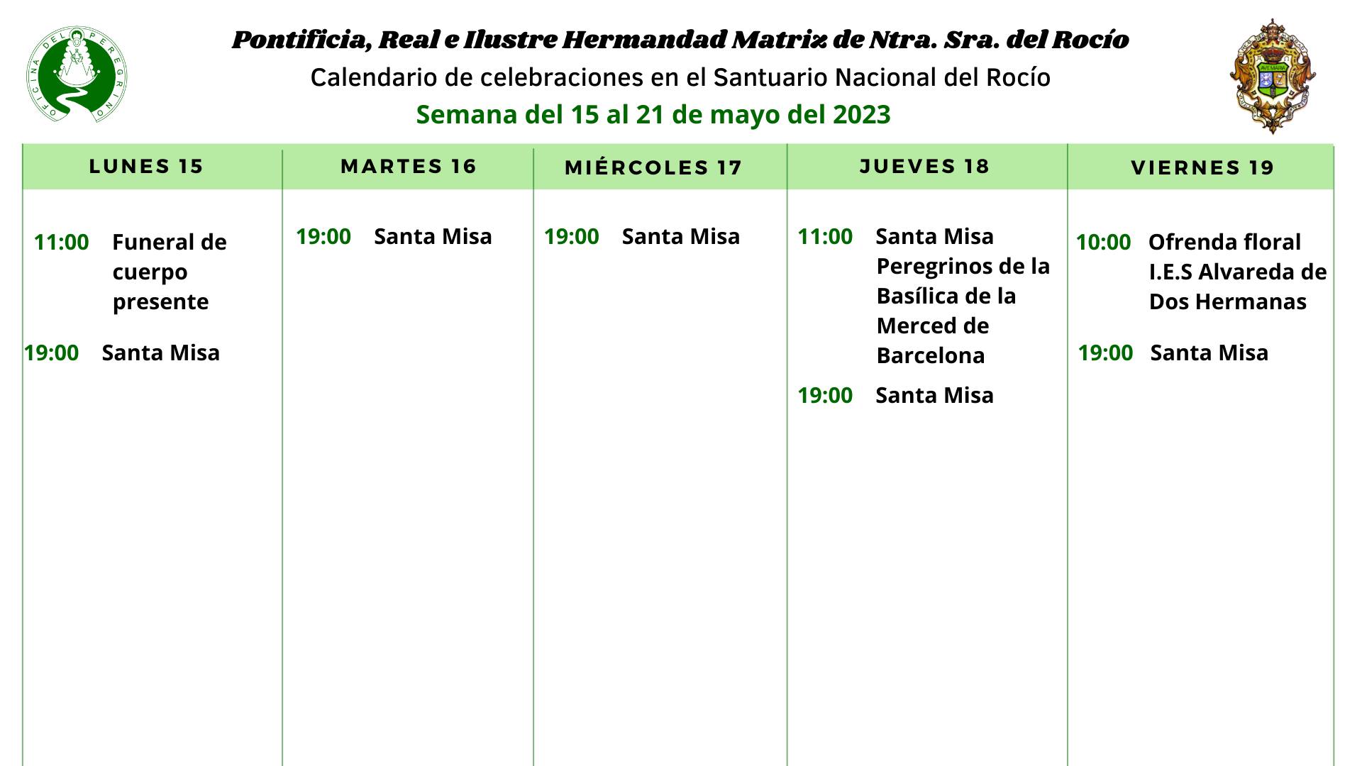 Calendario de celebraciones para la semana del 15 al 21 de mayo, en el Santuario de Ntra. Sra. del Rocío.