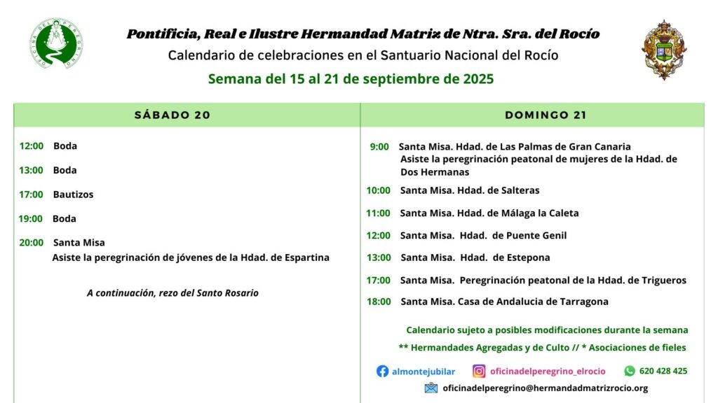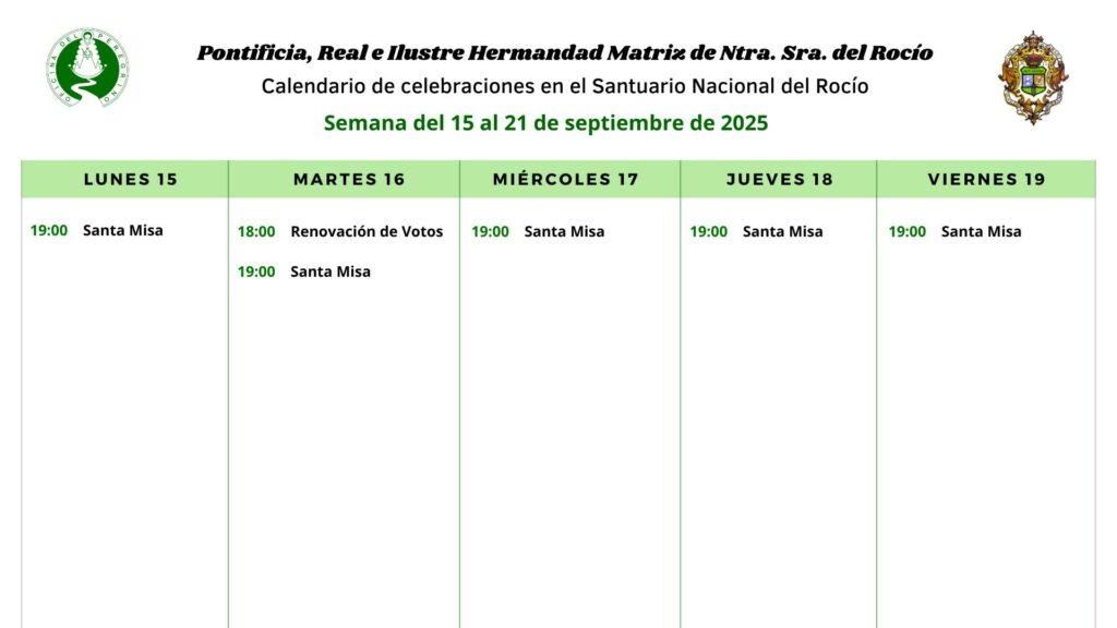 celebraciones para la semana del 15 al 21 de septiembre de 2025 en el Santuario de Ntra. Sra. del Rocío