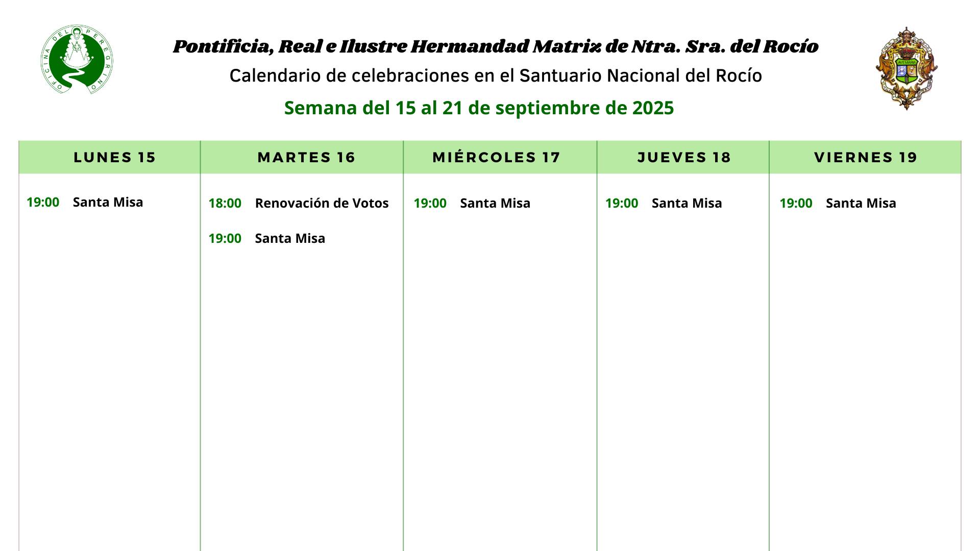 Calendario de celebraciones para la semana del 15 al 21 de septiembre en el Santuario de Ntra. Sra. del Rocío.
