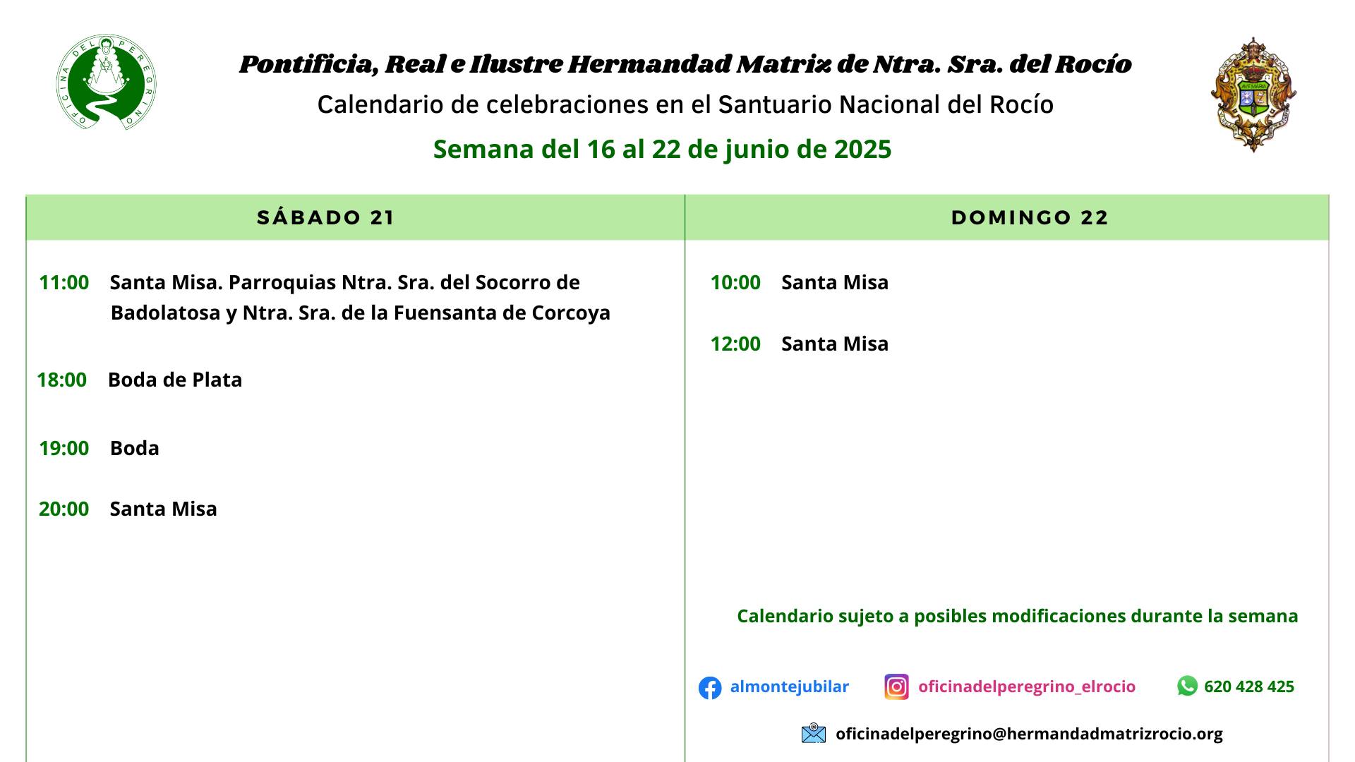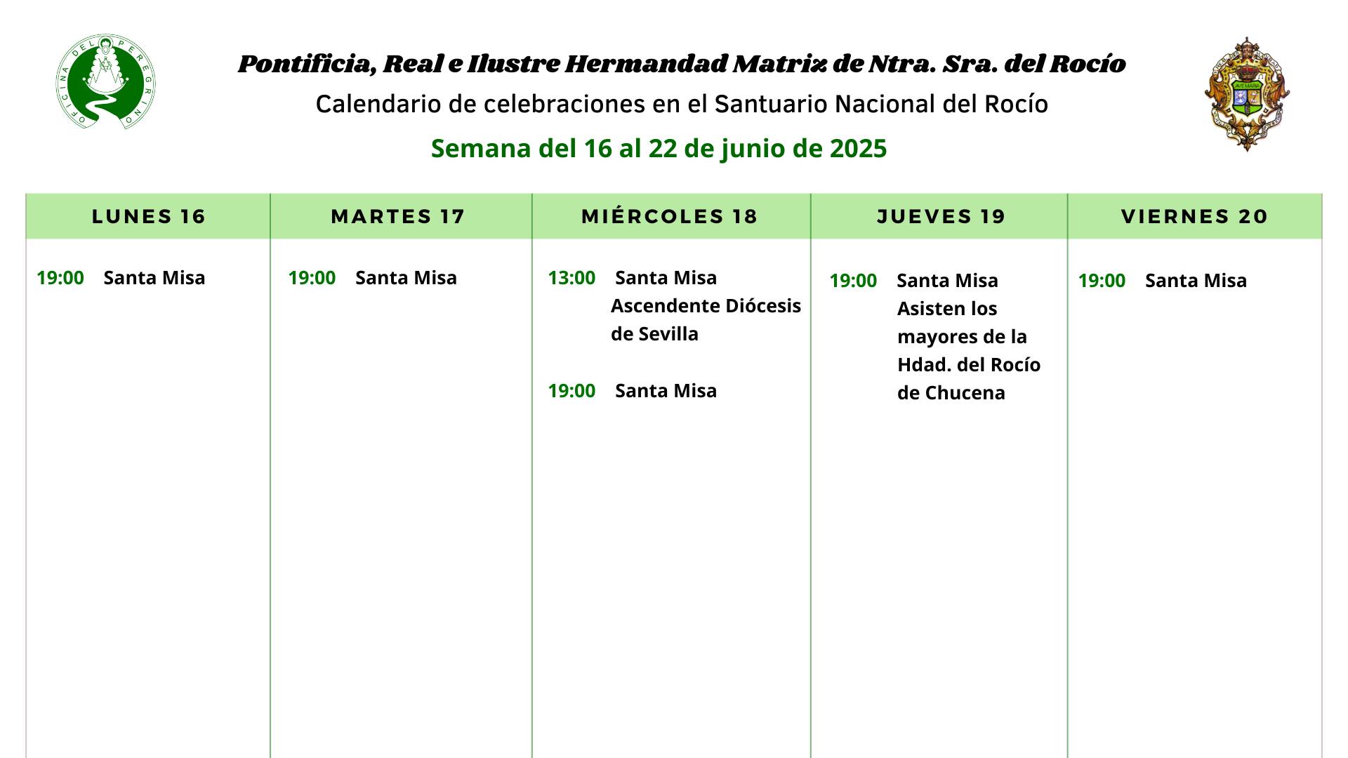 Calendario de celebraciones para la semana del 16 al 22 de junio en el Santuario de Ntra. Sra. del Rocío.