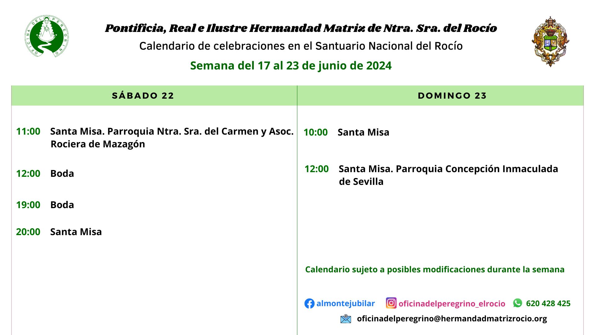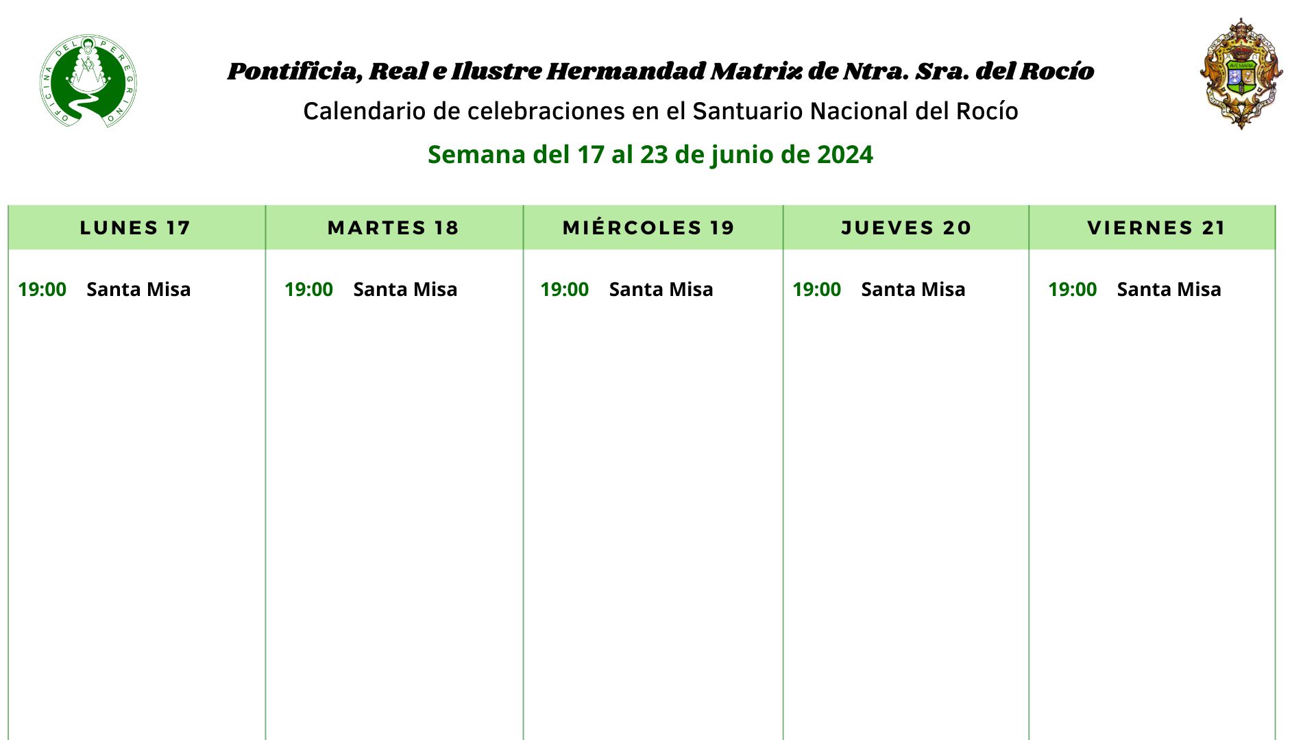 Calendario de celebraciones para la semana del 17 al 23 de junio, en el Santuario de Ntra. Sra. del Rocío.