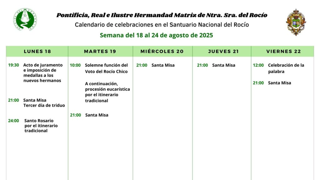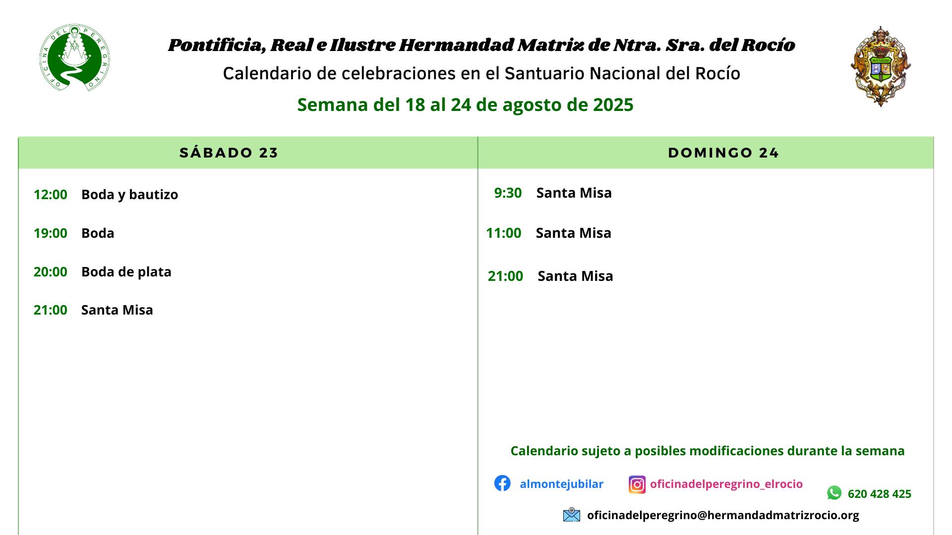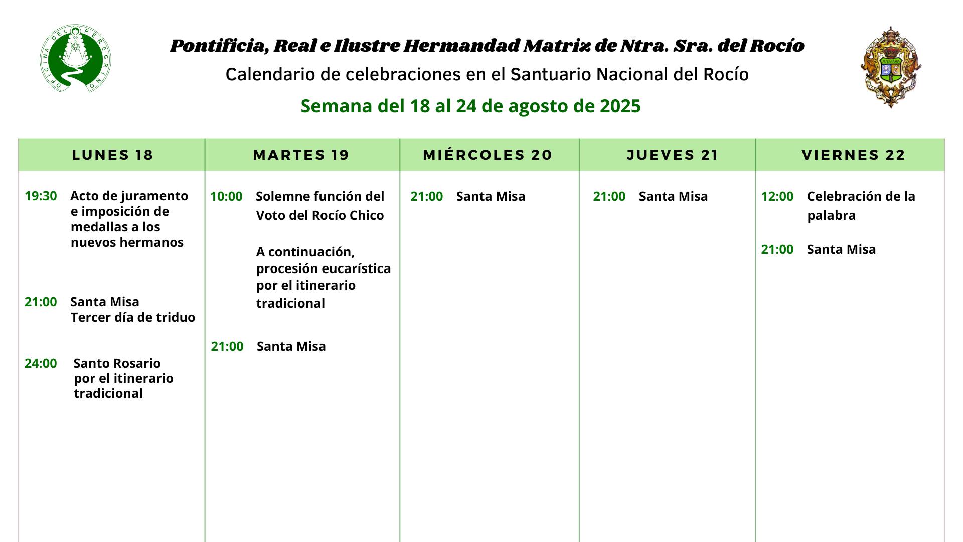 Calendario de celebraciones para la semana del 18 al 24 de agosto en el Santuario de Ntra. Sra. del Rocío.