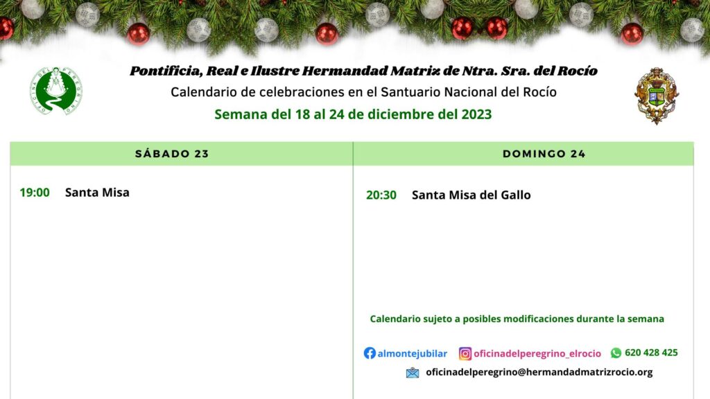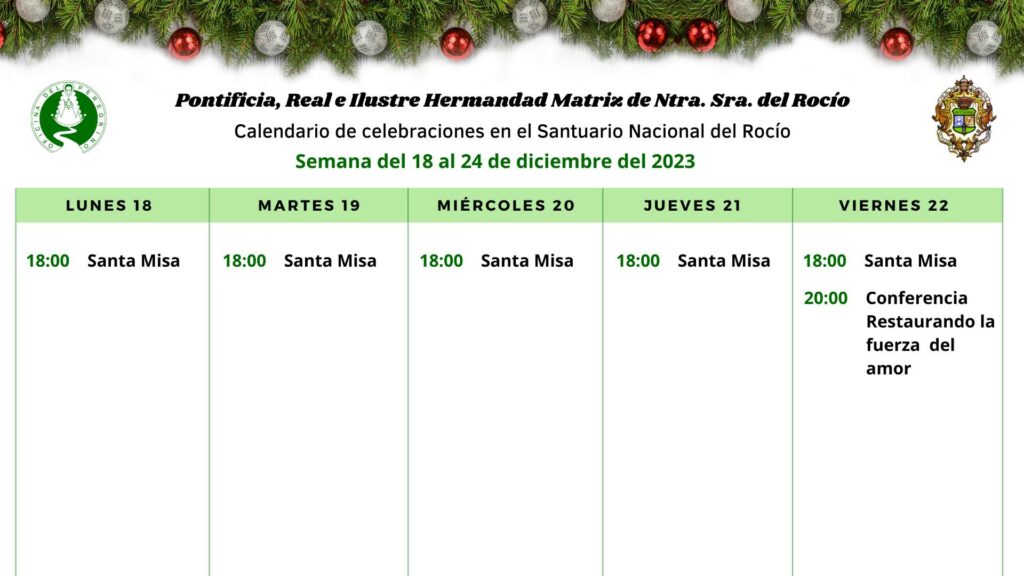 Calendario de celebraciones para la semana del 18 al 24 de diciembre, en el Santuario de Ntra. Sra. del Rocío.