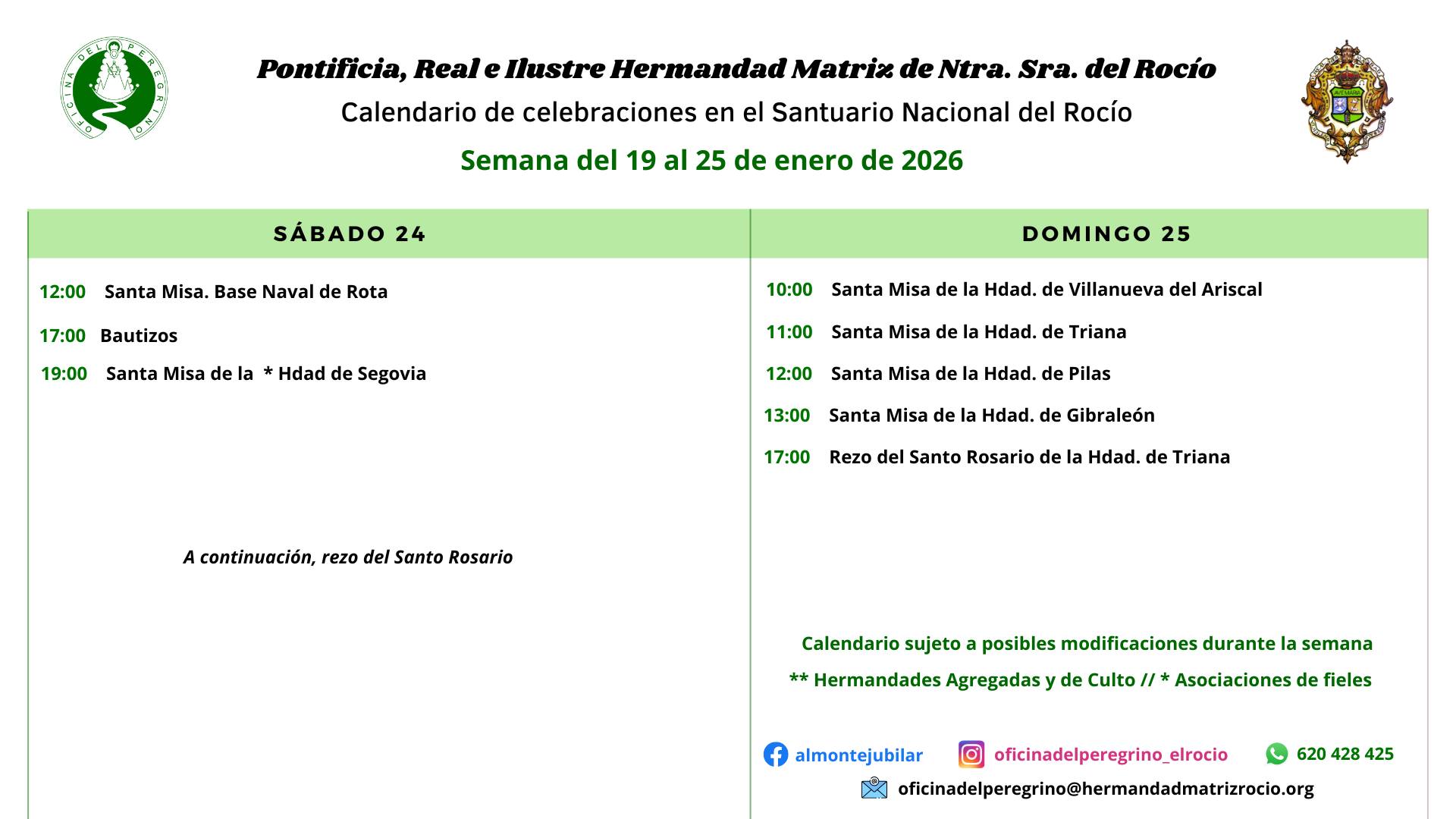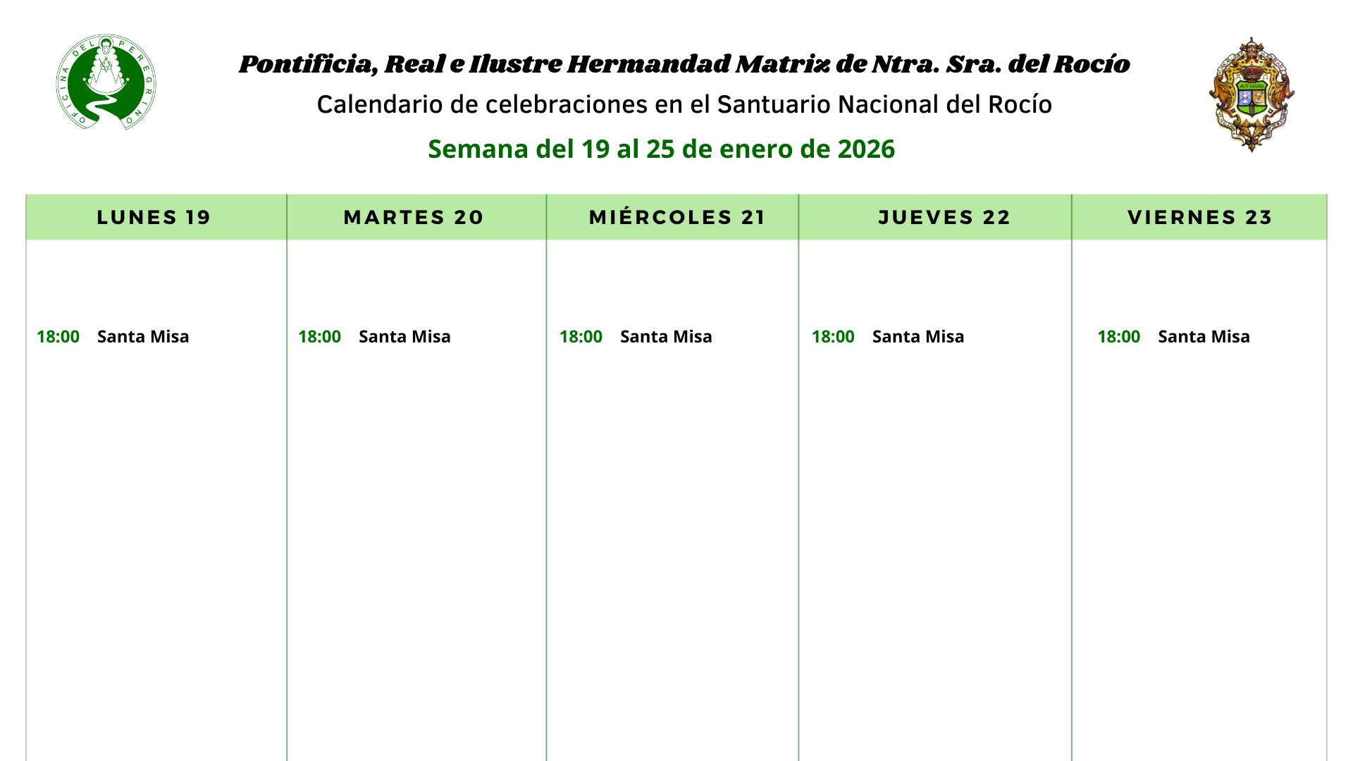 Celebraciones para la semana del 19 al 25 de enero de 2026 en el Santuario de Ntra. Sra. del Rocío.