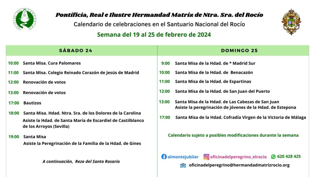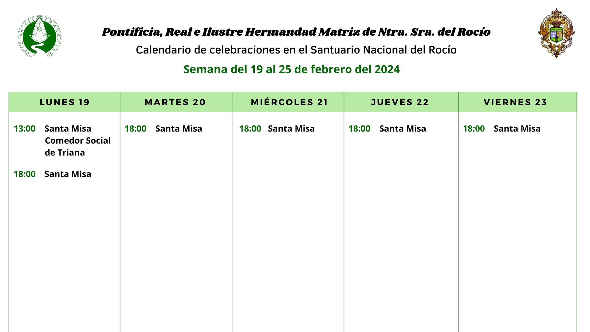Calendario de celebraciones para la semana del 19 al 25 de febrero, en el Santuario de Ntra. Sra. del Rocío.
