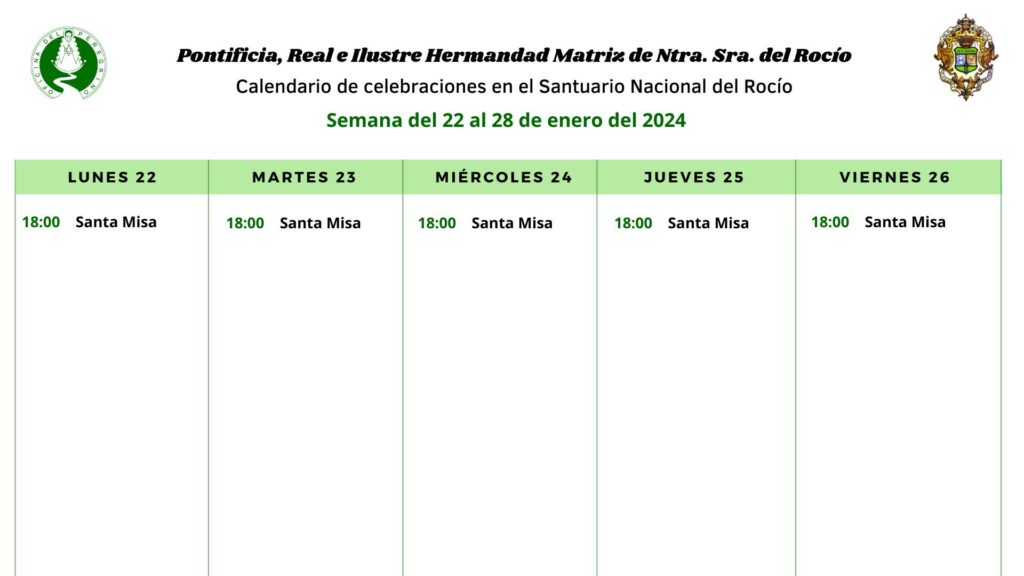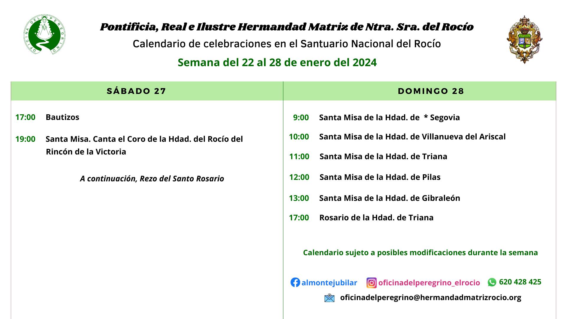 Calendario de celebraciones para la semana del 22 al 28 de enero, en el Santuario de Ntra. Sra. del Rocío.