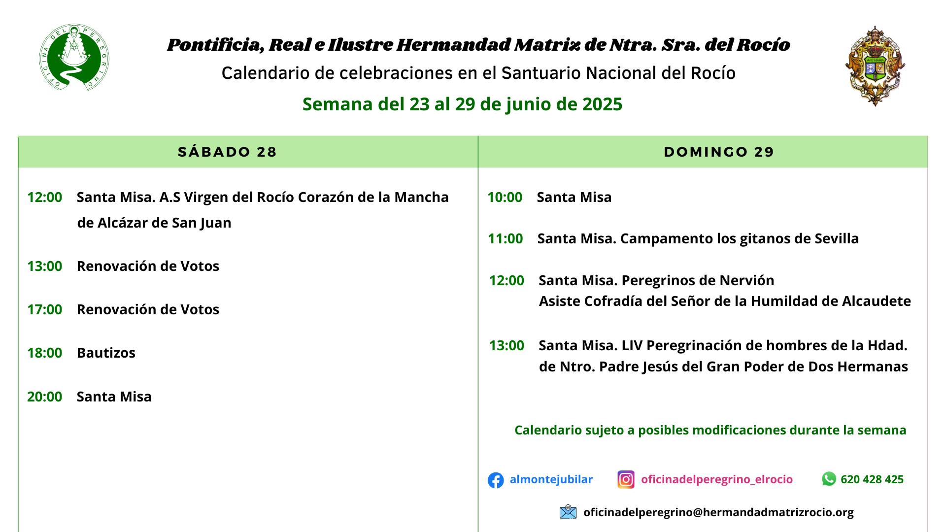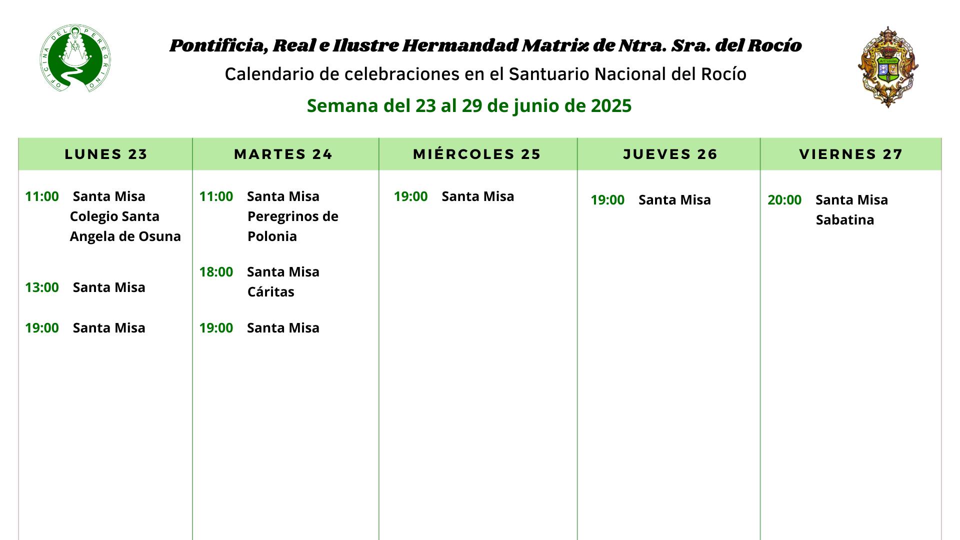 Calendario de celebraciones para la semana del 23 al 29 de junio en el Santuario de Ntra. Sra. del Rocío.
