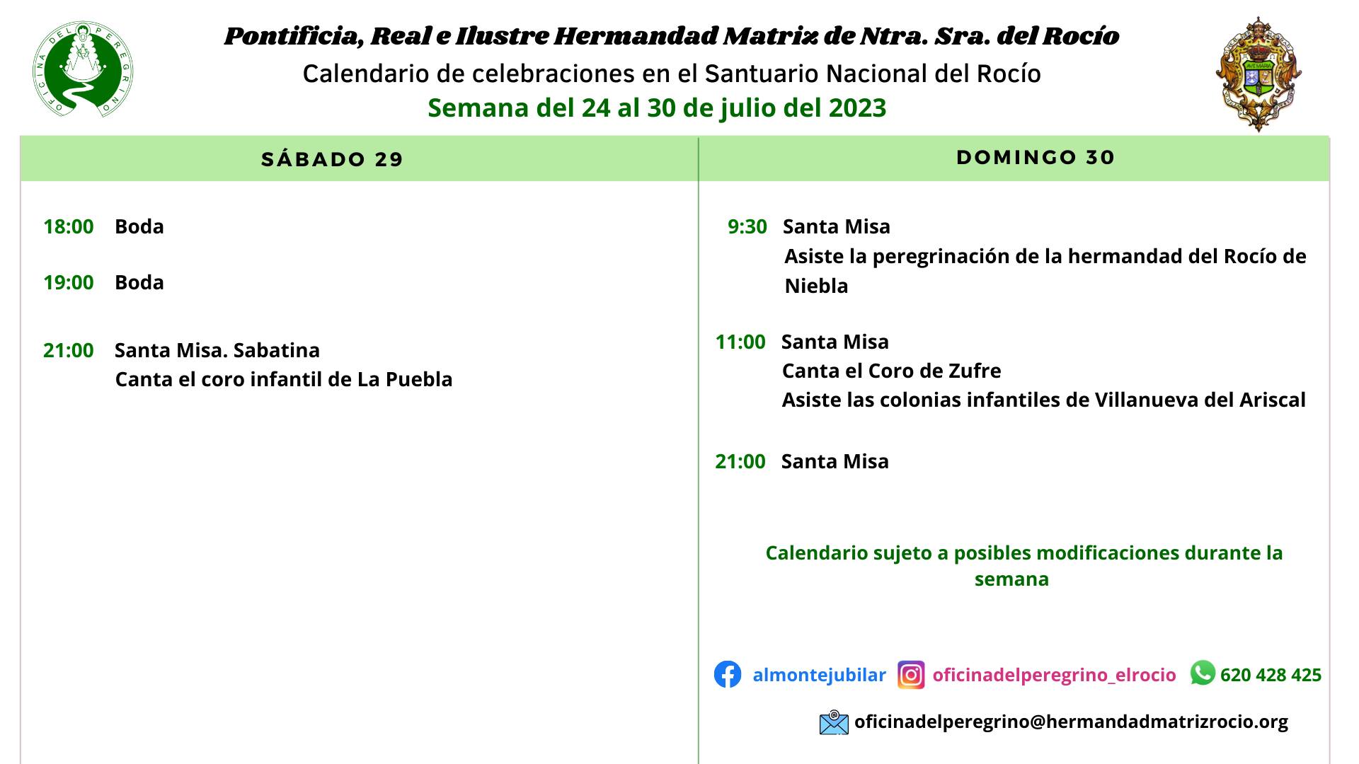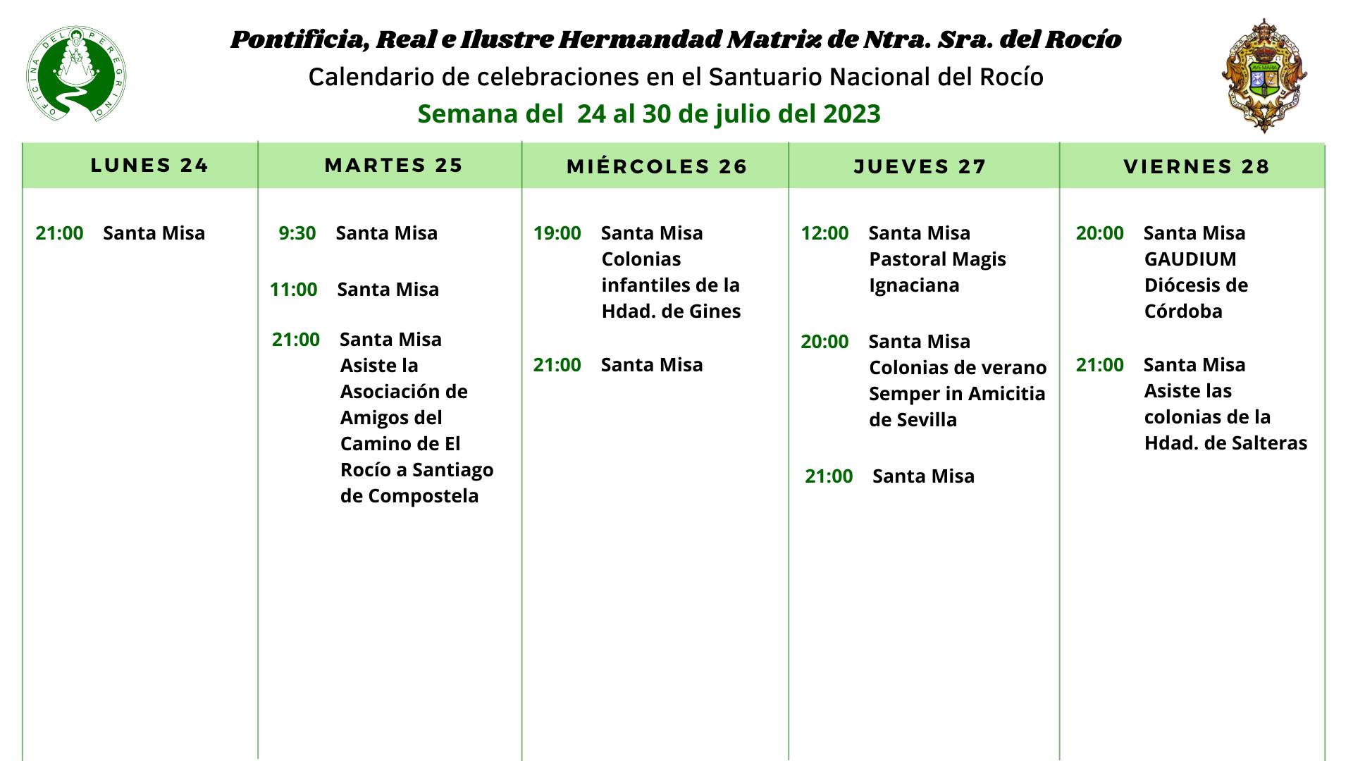 Calendario de celebraciones para la semana del 24 al 30 de julio, en el Santuario de Ntra. Sra. del Rocío.