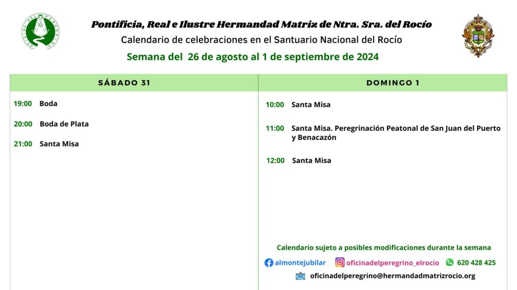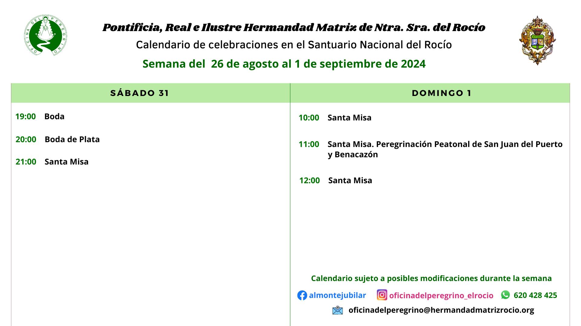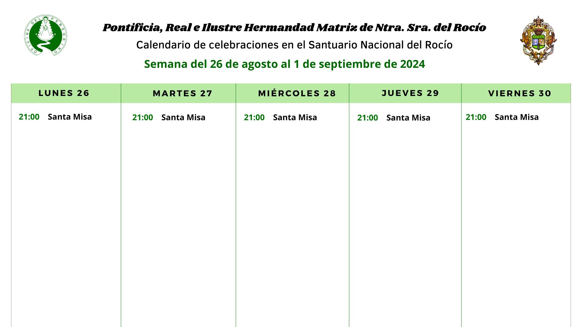Calendario de celebraciones para la semana del 26 de agosto al 1 de septiembre en el Santuario de Ntra. Sra. del Rocío.