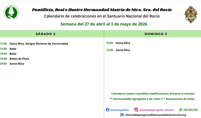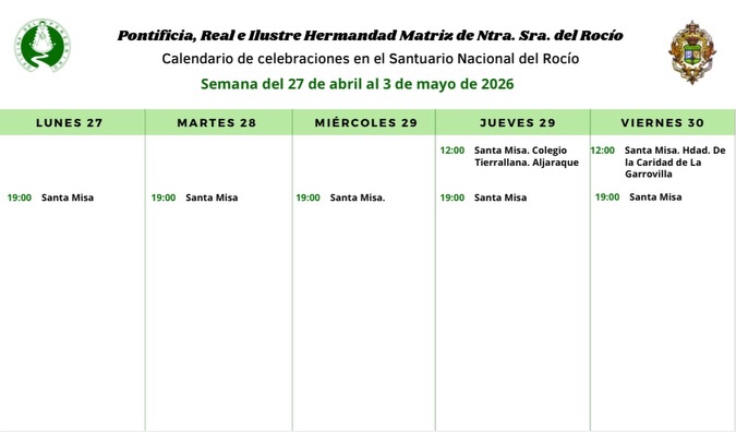 Celebraciones para la semana del 27 de abril al 3 de mayo de 2026 en el Santuario de Ntra. Sra. del Rocío.