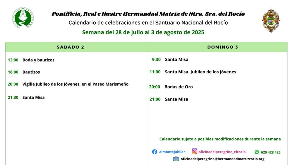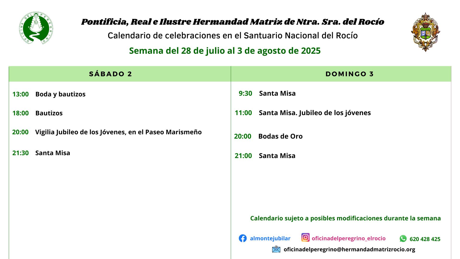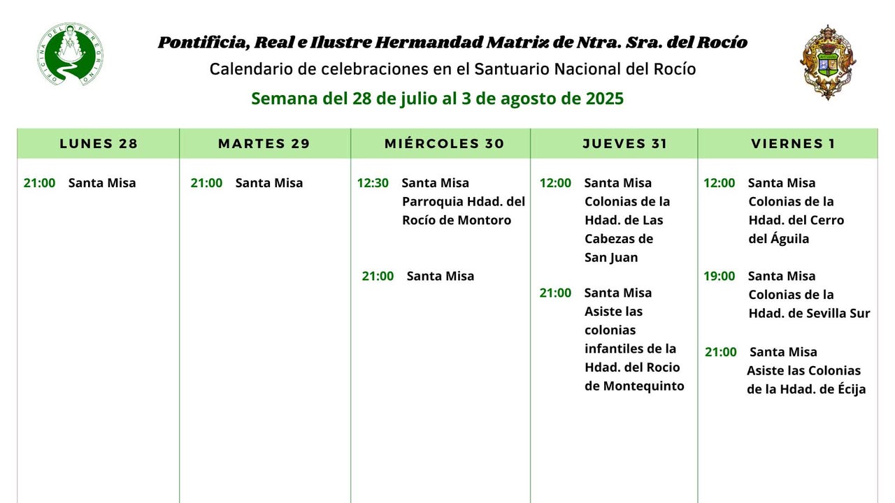 Calendario de celebraciones para la semana del 28 de julio al 3 de agosto en el Santuario de Ntra. Sra. del Rocío.