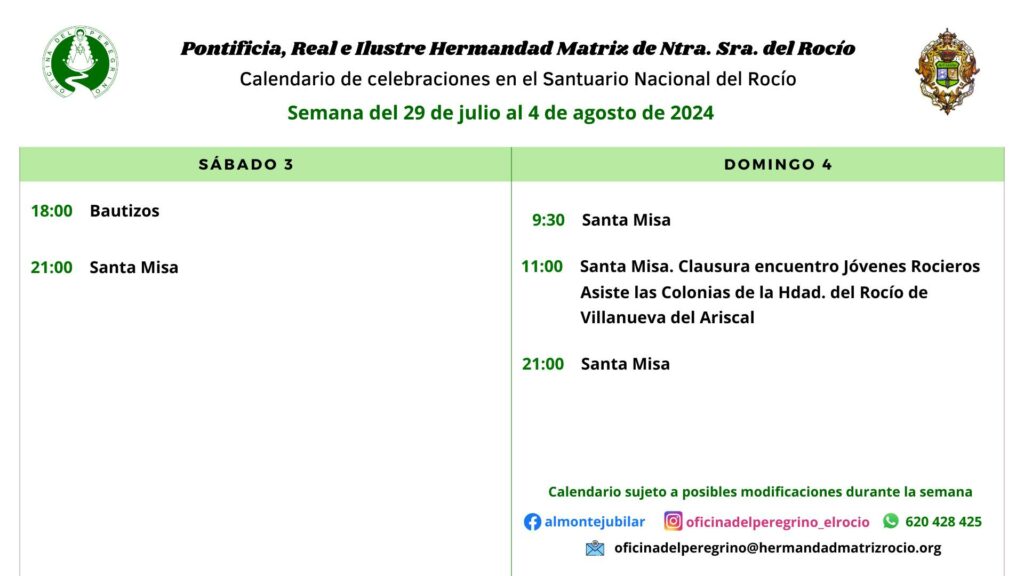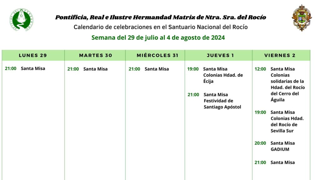 Calendario de celebraciones para la semana del 29 de julio al 4 de agosto en el Santuario de Ntra. Sra. del Rocío.